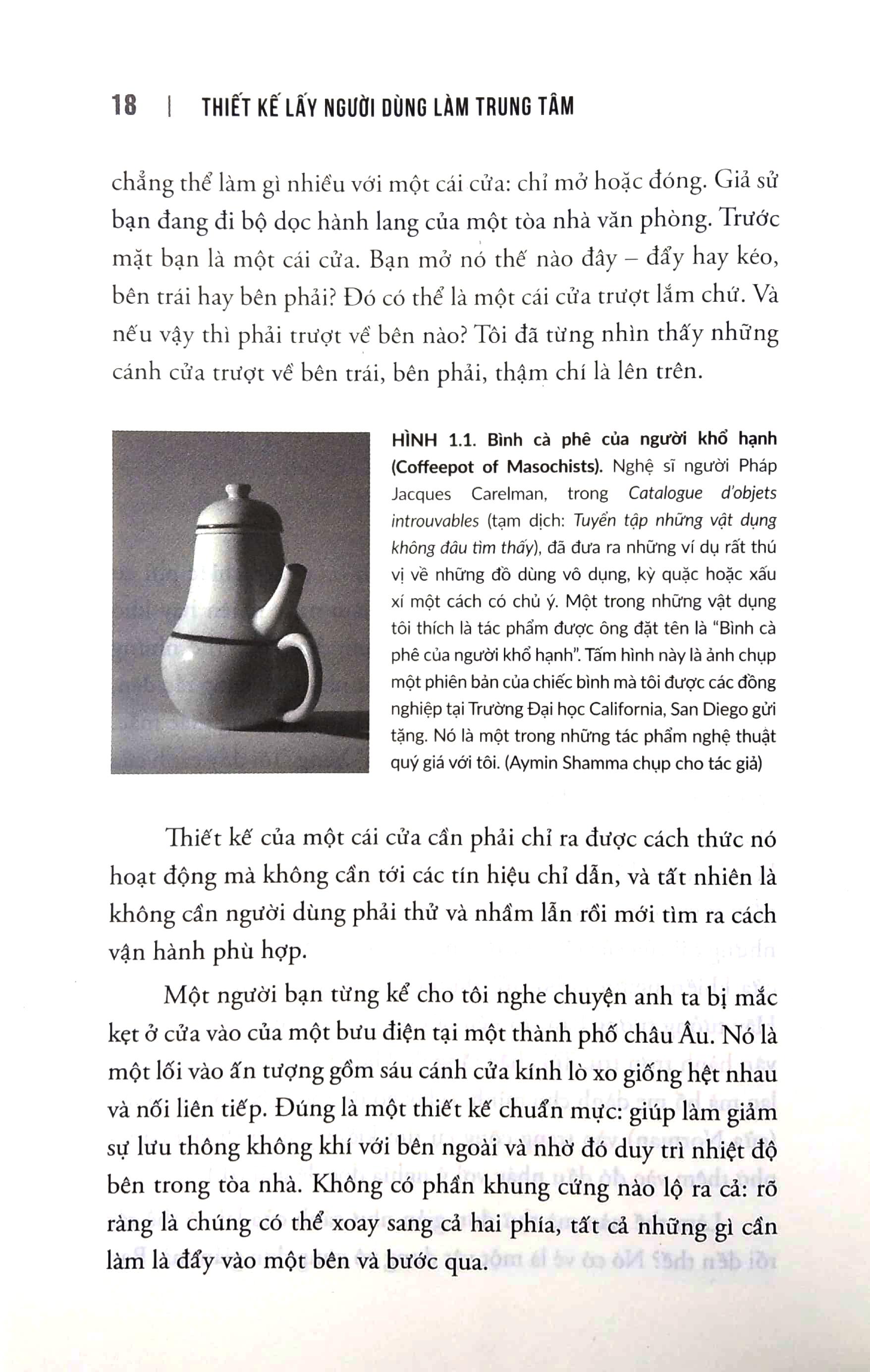 Design - Thiết Kế Lấy Người Dùng Làm Trung Tâm Tất cả chúng ta đều là nhà thiết kế! Dù không theo nghề thiết kế chuyên nghiệp, hằng ngày, chúng ta vẫn phải tự thiết kế cuộc sống, sắp xếp chỗ ở hay tổ chức cách làm việc khoa học. Vì thế, cuốn sách tuyệt vời này không chỉ dành cho các nhà thiết kế, các chuyên gia kỹ thuật mà phù hợp với tất cả mọi người. Cuốn sách giúp độc giả trở thành các nhà quan sát sắc sảo trước những thiết kế kém cỏi và ngớ ngẩn đang gây ra rắc rối cho cuộc sống của con người, đặc biệt là những sản phẩm liên quan tới công nghệ hiện đại. Don Norman sẽ khiến bạn phải gật gù tâm đắc khi phân tích thiết kế của các vật dụng thường ngày, từ bồn rửa tay, cánh cửa, ghế ngồi cho tới điện thoại hay giao diện phần mềm. Không chỉ vậy, Norman còn chỉ ra các nguyên tắc dựa trên tâm lý học nhận thức để thiết kế mọi thứ đúng đắn, khoa học. Bộ đôi này đã trở thành công cụ đầy sức mạnh để khiến cuộc sống của chúng ta trở nên thú vị, thoải mái và nhiều niềm vui hơn.