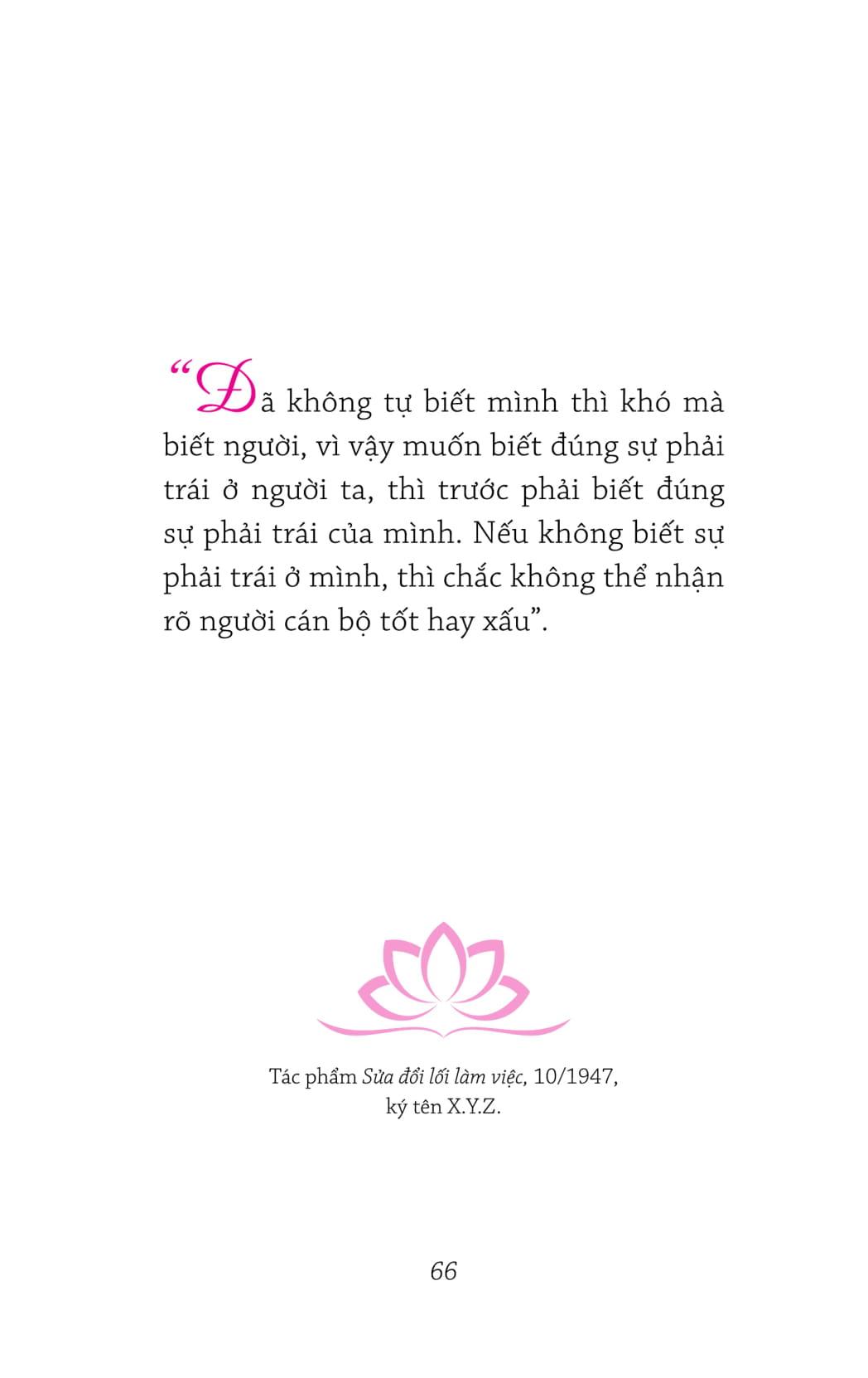 Nhà xuất bản Trẻ phối hợp với Phó giáo sư, Tiến sĩ Vũ Tình & Tiến sĩ Đặng Thị Minh Phượng, những người nghiên cứu về chuyên ngành Hồ Chí Minh, chắt lọc từ bộ Hồ Chí Minh toàn tập những bài phát biểu, những bài viết của Người về Cán bộ, bao gồm các nội dung: Tầm quan trọng của cán bộ; Phẩm chất của cán bộ; Chính sách cán bộ để giúp độc giả dễ tiếp cận hơn với tư tưởng Hồ Chí Minh về những nội dung này.