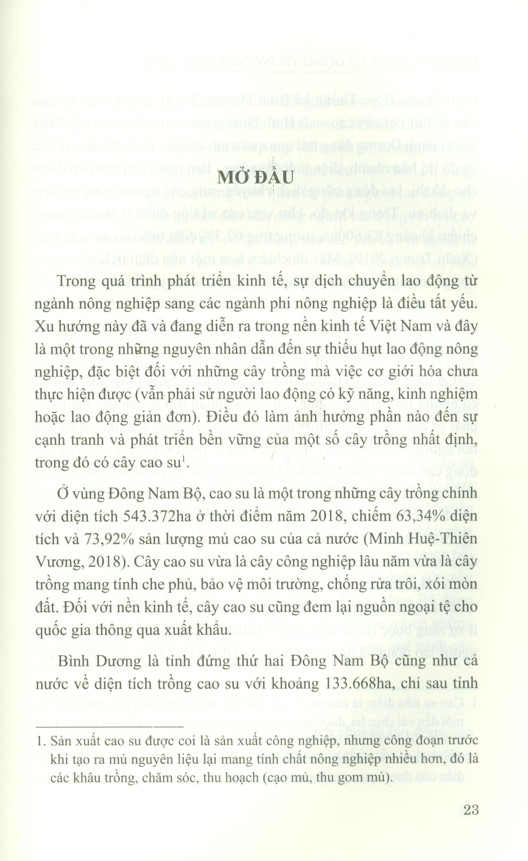Dịch chuyển lao động luôn gắn liền với quá trình công nghiệp hóa, đô thị hóa và sự phát triển của mỗi quốc gia hay mỗi địa phương. Nội dung cuốn sách cho thấy cùng với tình trạng giá cao su sụt giảm liên tục trong thời gian qua thì sự dịch chuyển lao động đã gây ra tính thiếu ổn định và tạo áp lực thiếu hụt lao động (nhất là lao động trẻ) đối với ngành cao su tiểu điền. Điều này đặt ra cho khu vực cao su tiểu điền nói chung và Bình Dương nói riêng những vấn đề về sự tồn tại và phát triển trong tương lai. Đặc biệt, cuốn sách tập trung phản ánh thực trạng lao động, xu hướng dịch chuyển lao động cao su tiểu điền tại tỉnh Bình Dương trong bối cảnh đô thị hóa cao của tỉnh trong những năm qua và nhận định về xu hướng dịch chuyển lao động cao su tiểu điền trong tương lai. Từ đây, tác giả thảo luận những chính sách chung đối với ngành cao su, đồng thời khuyến nghị chính sách riêng đối với lao động cao su tiểu điền và đề xuất một số giải pháp quản trị lao động cao su tiểu điền.
