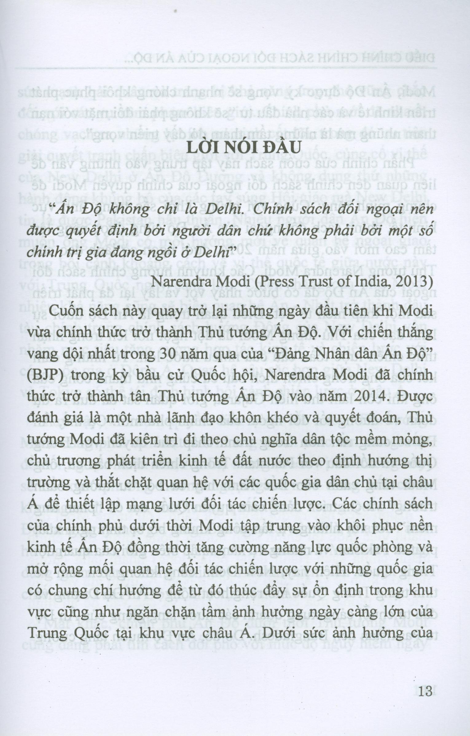 “Ấn Độ không chỉ là Delhi. Chính sách đối ngoại nên được quyết định bởi người dân chứ không phải bởi một số chính trị gia đang ngồi ở Delhi” Narendra Modi (Press Trust of India, 2013) Cuốn sách này quay trở lại những ngày đầu tiên khi Modi vừa chính thức trở thành Thủ tướng Ấn Độ. Với chiến thắng vang dội nhất trong 30 năm qua của “Đảng Nhân dân Ấn Độ” (BJP) trong kỳ bầu cử Quốc hội, Narendra Modi đã chính thức trở thành tân Thủ tướng Ấn Độ vào năm 2014. Được đánh giá là một nhà lãnh đạo khôn khéo và quyết đoán, Thủ tướng Modi đã kiên trì đi theo chủ nghĩa dân tộc mềm mỏng, chủ trương phát triển kinh tế đất nước theo định hướng thị trường và thắt chặt quan hệ với các quốc gia dân chủ tại châu Á để thiết lập mạng lưới đối tác chiến lược. Các chính sách của chính phủ dưới thời Modi tập trung vào khôi phục nền kinh tế Án Độ đồng thời tăng cường năng lực quốc phòng và mở rộng mối quan hệ đối tác chiến lược với những quốc gia có chung chí hướng để từ đó thúc đẩy sự ổn định trong khu vực cũng như ngăn chặn tầm ảnh hưởng ngày càng lớn của Trung Quốc tại khu vực châu Á. Dưới sức ảnh hưởng của Modi, Ấn Độ được kỳ vọng sẽ nhanh chóng khôi phục phát triển kinh tế và các nhà đầu tư “sẽ không phải đổi mặt với nạn tham nhũng mà là những tấm thảm đỏ đầy triển vọng”. Phần chính của cuốn sách này tập trung vào những vấn đề liên quan đến chính sách đối ngoại của chính quyền Modi để chứng minh rằng: Cùng với những khởi sắc trong lĩnh vực kinh tế, chính sách đối ngoại của Ấn Độ cũng được nâng lên tầm cao mới vào giữa năm 2014, dưới ngọn cờ lãnh đạo của Thủ tướng Narendra Modi. Các khuynh hướng chính sách đối ngoại của Ấn Độ đã có bước nhảy vọt và lấy lại đà phát triển sau một thập niên tê liệt. Điều quan trọng là Ấn Độ dưới sự lãnh đạo của Thủ tướng Modi đã đột ngột nổi lên trong nhận thức chiến lược toàn cầu của nhiều nước lớn. Từ những cam kết của ông trong chiến dịch bầu cử cũng như thành công của ông khi còn làm thủ hiến Gujarat, giới quan sát đã đưa ra dự đoán về đường lối đối ngoại của chính phủ mớ