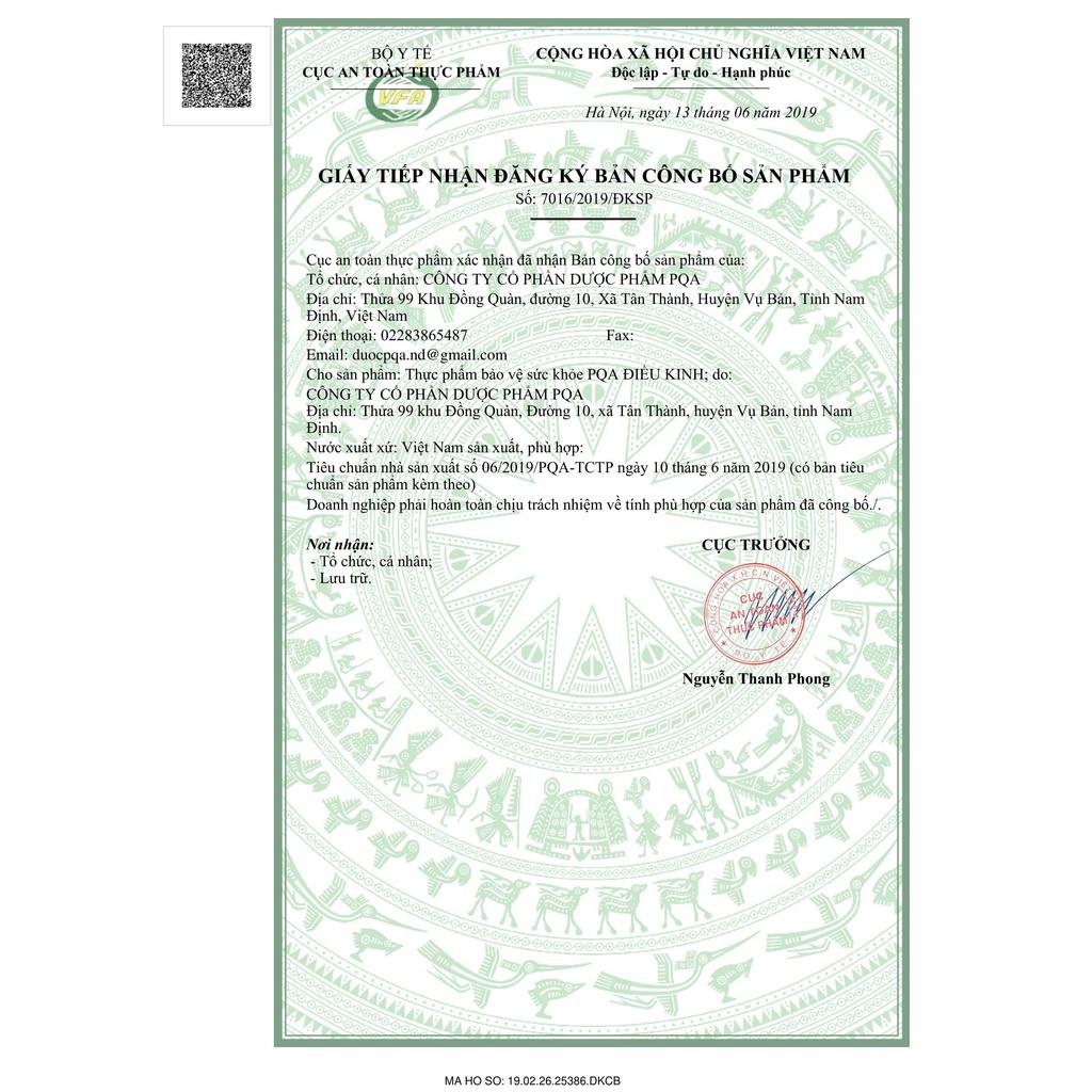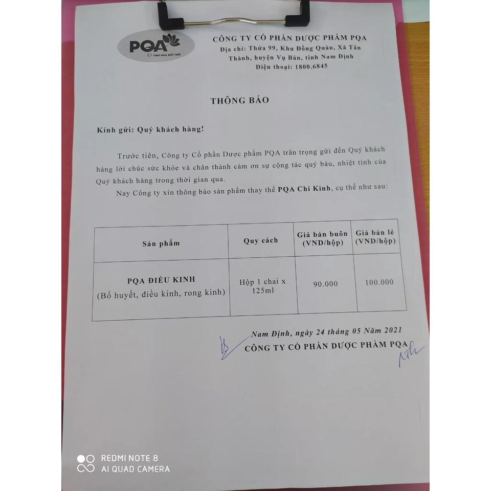 Điều Kinh PQA Giúp Bổ Huyết Điều Hòa Kinh Nguyệt, Đau Bụng Rong Kinh Hộp 125ml THÔNG TIN SẢN PHẨM: - Xuất xứ: Việt Nam - Dung tích: 125ml - Ngày sản xuất: In trên