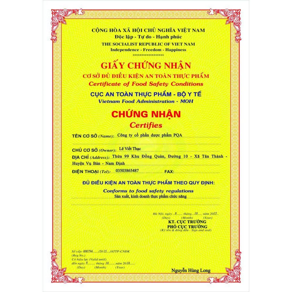 - Địa chỉ sản xuất: Công ty Cổ phần Dược phẩm PQA. Thửa 99, Khu Đồng Quàn, Xã Tân Thành, Huyện Vụ Bản, Tỉnh Nam Định. THÀNH PHẦN: