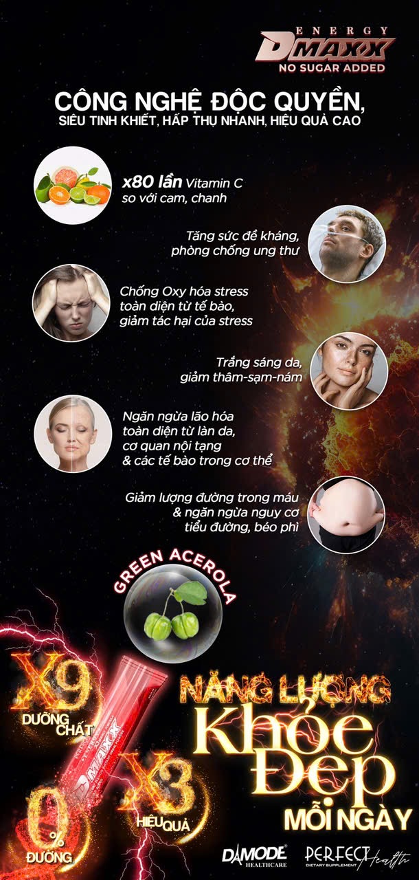 Thức uống năng lượng Dmaxx Energy Formula   Dmaxx energy formula là sản phẩm thức uống năng lượng có chức năng bổ sung năng lượng cho người uống mỗi ngày dưới dạng thức uống hòa tan. Sản phẩm có xuất xứ từ Thái Lan và đối tượng sử dụng là cả nam giới và nữ giới trong độ tuổi từ 18  tuổi. Sản phẩm là sự kết hợp từ chất được chiết suất từ trái cây thiên nhiên và hoạt chất axit hữu cơ tổng hợp. Sản phẩm có thiết kế nhỏ gọn và dễ dàng mang theo để sử dụng mỗi ngày. Đây là một trong những sản phẩm uống năng lượng được nhiều người tiêu dùng lựa chọn và tin dùng. Sản phẩm được chứng nhận và được kiểm tra lâm sàng trước khi đưa ra thị trường. Vì vậy người tiêu dùng hoàn toàn có thể yên tâm mua và sử dụng sản phẩm. Thành phần chính của Dmaxx energy formula: Thành phần của Dmaxx energy formula được kết hợp từ nhiều dưỡng chất tốt của trái cây và hoa chất axit hữu cơ tổng hợp. Các thành phần này chủ yếu là các dưỡng chất thiết yếu cần thiết cho cơ thể con người. Thành phần chính có trong Dmaxx Energy Formula gồm có: nhân sâm, cà chua, trà xanh, gừng,… Ngoài ra trong Dmaxx energy formula còn có các thành phần khác như: Sucrose, Dextrose, Malic Acid, Citric Acid Anhydrous, Guarana Extract, Tricalcium Phosphate, Mixed Berry Flavor, Sodium Chloride, Sucralose, L-Ornithine Hydrochloride, L-Arginine Hydrochloride, L-lysine Hydrochloride, Vitamin B12, Folic Acid, Ascorbic Acid,… Sản phẩm cam kết Có thành phần chiết suất 100 % từ thiên nhiên an toàn và dễ dàng sử dụng cho người sử dụng.  Công dụng của Dmaxx
