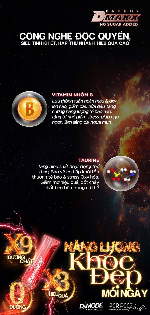 Dmaxx energy formula là sản phẩm thức uống năng lượng có chức năng bổ sung năng lượng cho người uống mỗi ngày dưới dạng thức uống hòa tan.