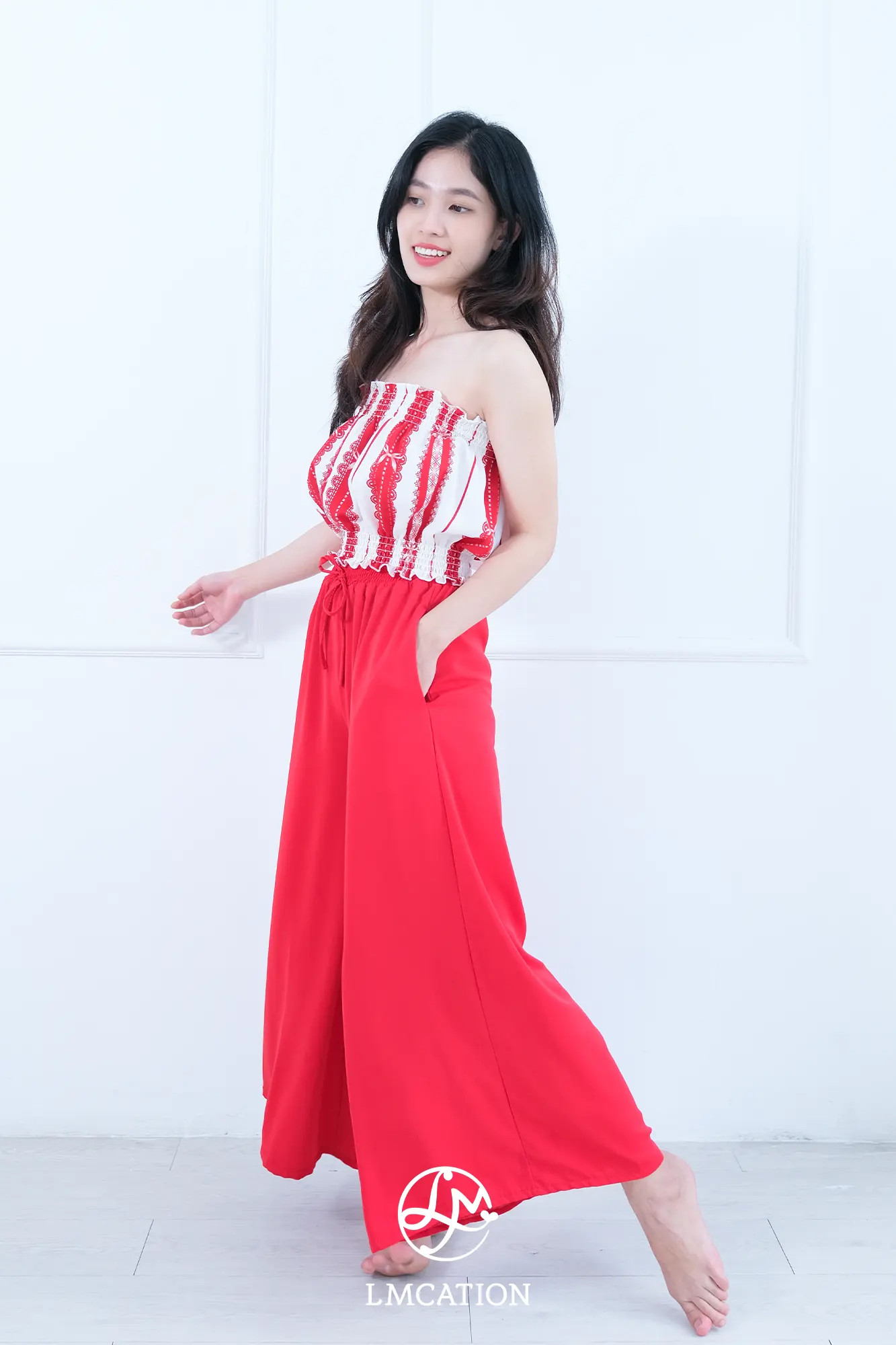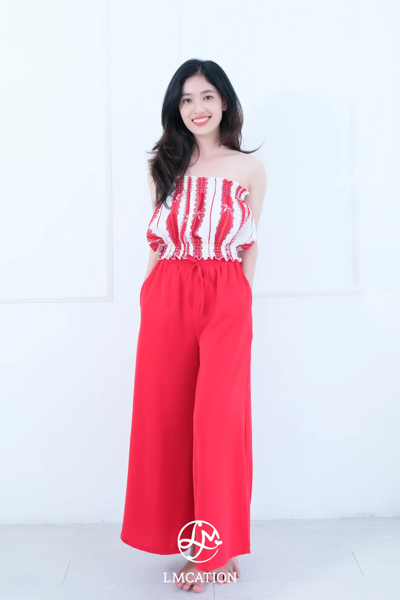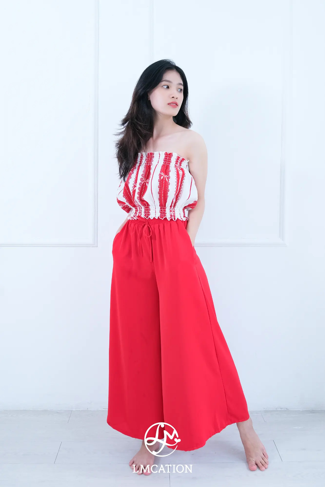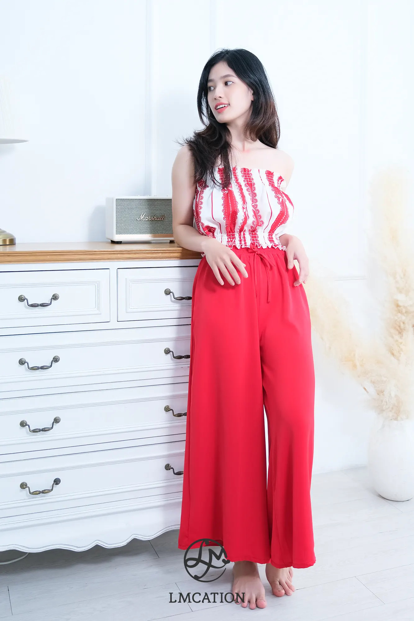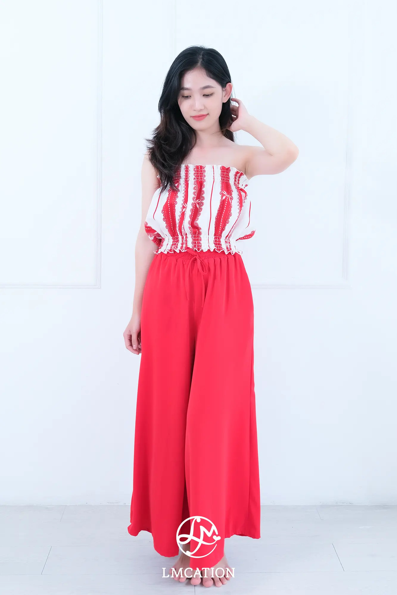 ✨Đồ Bộ Mặc Nhà LMcation - Áo ống Carol màu sọc nơ đỏ & Quần váy dài Mila màu đỏ