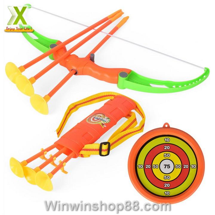 - Bộ Sản Phẩm Gồm: 1 Cung Và 3 Mũi Tên Có Gắn Nút Cao Su Có Thể Dính Được VàoTường Và 1 Bia Bắn.