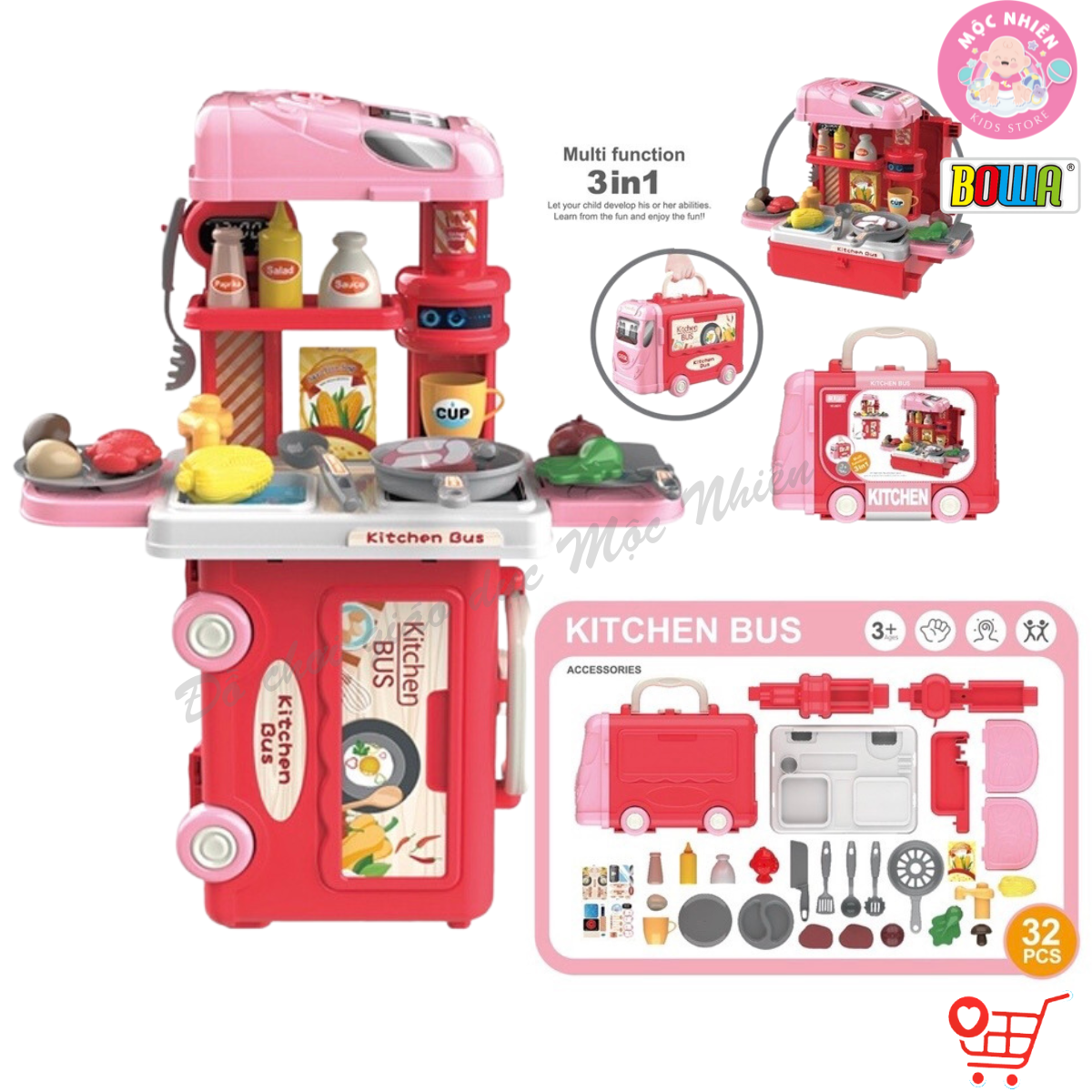 - Bộ sản phẩm đồ chơi nhập vai BOWA 8075 – Xe buýt nhà bếp 32 chi tiết với các dụng cụ nhà bếp như chén, bát, muỗng, nĩa, nồi niêu xoong chảo ... giúp bé thỏa thích nhập vai làm anh/cô đầu bếp thực thụ. Đặc biệt thiết kế có thể biến đổi thành 1 trong 3 kiểu dáng gồm kệ đứng, kệ để bàn và xe bú y tế có bánh xe đẩy được sẽ rất thú vị cho bé chơi mỗi ngày, giả định vào nhiều tình huống khác nhau.