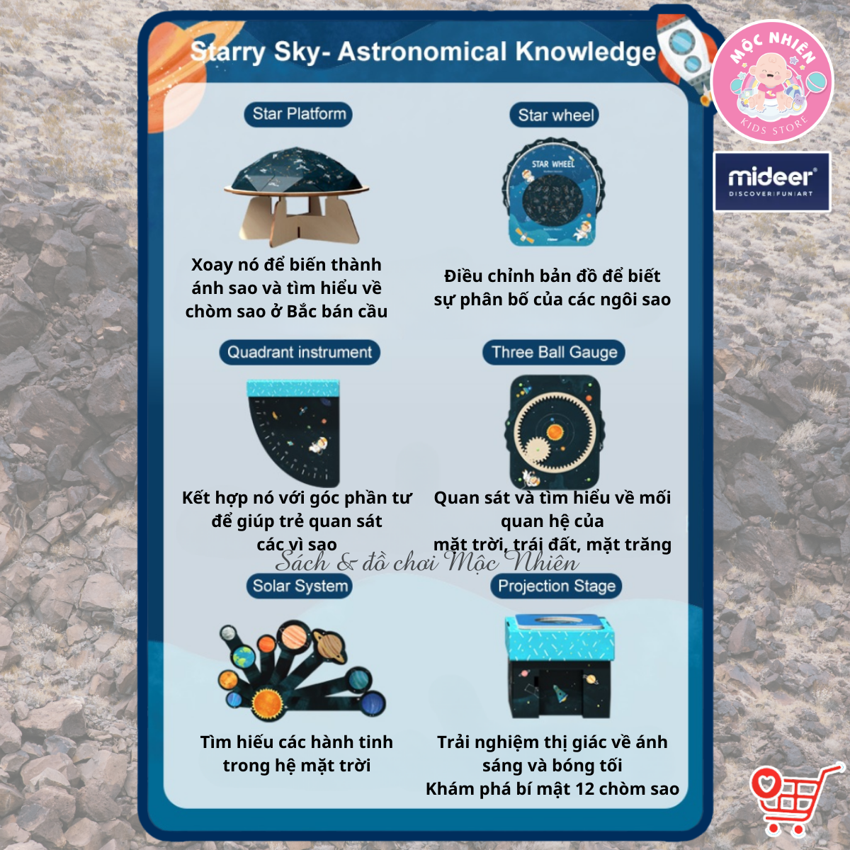 - Hành tinh và Vũ trụ (UNDER THE STARS – STARRY SKY) gồm 6 bộ phương tiện nghiên cứu thiên văn học và hệ mặt trời