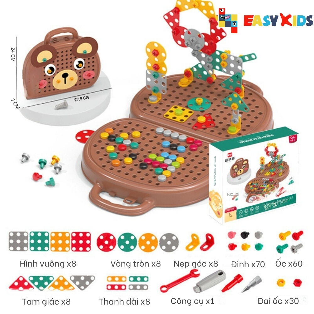Với bộ đồ chơi lắp ghép vali kỹ sư, bé có thể thỏa sức phát triển tư duy và kỹ năng thực hành. Bộ đồ chơi vali kỹ sư gấu, đồ chơi kỹ sư lắp rắp , kèm khoan điện lắp ốc vít giúp bé rèn luyện đức tính kiên trì của mình. Trẻ sẽ cảm thấy tự hào, sung sướng khi hoàn thành 1 sản phẩm, và nhờ vậy cũng giúp trẻ hình thành tính độc lập và sự tự tin vào bản thân. Đừng bỏ lỡ cơ hội sở hữu một sản phẩm giáo dục và giải trí đa năng cho bé yêu của bạn ngay hôm nay!
