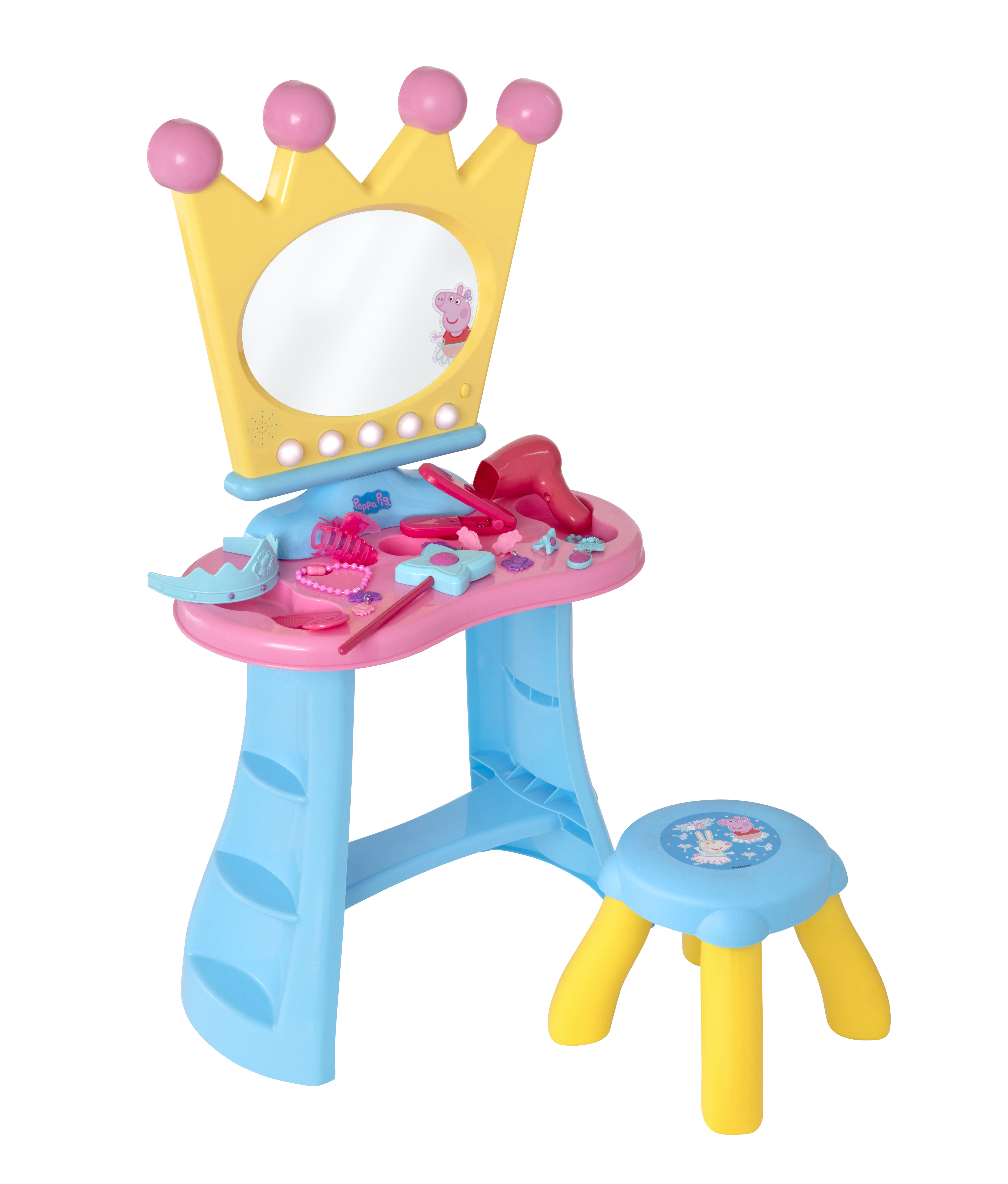 - Chiếc bàn xinh xắn với màu sắc vàng xanh với gương phát sáng hình vương miện. Ấn nút! Giai điệu Peppa Pig quen thuộc cất lên!
