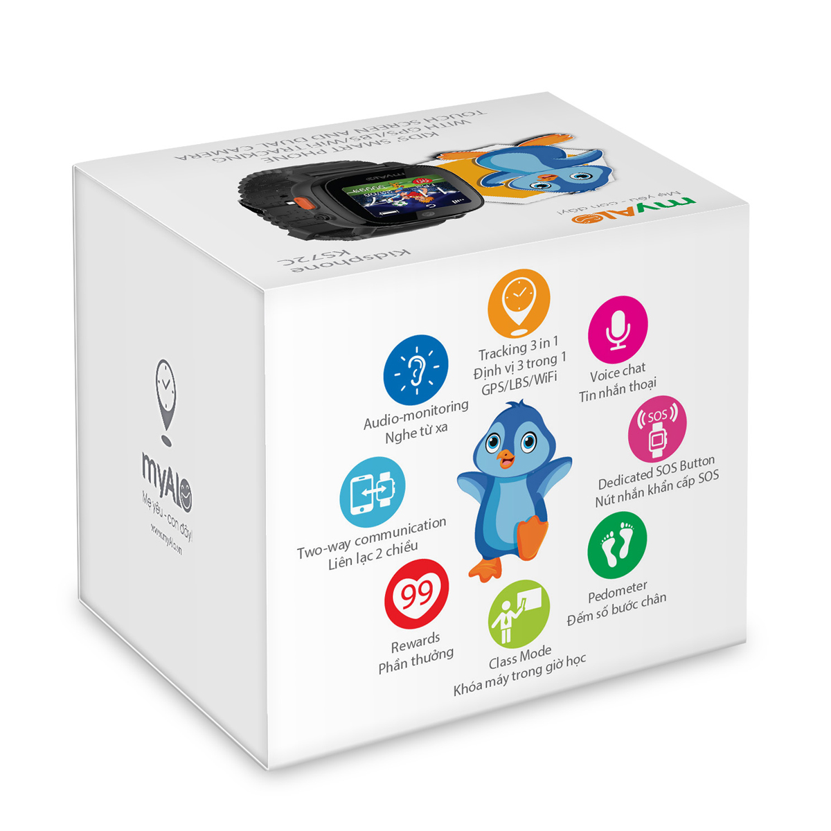 - Liên lạc thường: Bạn cũng có thể thêm những liên lạc chỉ có chức năng gọi điện 2 chiều vào danh bạ cho trẻ. Điện thoại myAlo KS72C và Ứng dụng myAlo myKids được thiết lập sẵn nhiều hình ảnh sinh động để bạn lựa chọn làm ảnh đại diện cho các liên lạc trong danh bạ của trẻ, mang lại sự thú vị và ấn tượng đẹp cho trẻ. Kết bạn Hãy trao cho trẻ những cơ hội được liên lạc với bạn bè sau khi tan trường! Điện thoại myAlo KS72C giúp trẻ có thể tự thêm bạn bè của mình vào danh bạ liên lạc bằng cách kết bạn với các điện thoại cùng loại thông qua Bluetooth. Khi kết bạn thành công, trẻ có thể gọi điện và gửi tin nhắn thoại 2 chiều với bạn bè của mình. Ứng dụng myAlo myKids sẽ giúp Bạn biết được toàn bộ danh sách điện thoại bạn bè của trẻ và bạn có toàn quyền kiểm soát danh sách này. Bạn có thể xóa bỏ bất kỳ số liên lạc nào trong danh sách bạn bè của trẻ ra khỏi danh bạ của Điện thoại KS72C bất cứ lúc nào. BẢO VỆ KỊP THỜI Sự an toàn của con trẻ luôn là mối quan tâm hàng đầu của các bậc cha mẹ, điện thoại myAlo KS72C được thiết kế như một vệ sỹ ảo luôn đồng hành bên cạnh trẻ, giúp bạn bảo vệ sự an toàn cho trẻ và mang đến cho trẻ một không gian thoải mái và tuyệt vời nhất Nút khẩn cấp SOS Con bạn có thể gửi một cảnh báo khần cấp SOS bất cứ lúc nào chúng cần. Đừng lo lắng, hãy dành cho trẻ không gian thoải mái để vui chơi! Điện thoại myAlo KS72C được tích hợp sẵn nút khẩn cấp SOS, khi gặp nguy hiểm hoặc cần trợ giúp, trẻ chỉ cần nhấn và giữ vào nút SOS trong 3 giây, nó sẽ gửi đồng thời cho cả bạn và những người giám hộ một cảnh báo tức thì kèm theo vị trí của con bạn và một bản ghi âm 15 giây về môi trường xung quanh trẻ ngay lập tức. Vùng an toàn Thật tuyệt vời, ngay bây giờ bạn sẽ cảm thấy thoải mái và yên tâm hơn về sự an toàn của trẻ với công nghệ cảnh báo an ninh tiên tiến của chúng tôi. Ứng dụng myAlo myKids đi tiên phong trong việc cho phép bạn có thể thiết lập nhiều vùng an toàn với các địa điểm mà trẻ thường xuyên đến theo lịch trình từng ngày trong tuần với các khung thời gian khác nhau. Hệ thống định vị GPS/LBS/Wifi tích hợp trên điện thoại myAlo KS72C sẽ giúp bạn giám sát trẻ, nếu phát hiện trẻ ra khỏi hàng rào an toàn đã thiết lập, nó sẽ gửi một cảnh báo đến trung tâm tin nhắn cho bạn kèm theo vị trí của trẻ Chế độ Bận học Chế độ “Bận học” mang đến cho trẻ một không gian thật sự yên tĩnh khi học tập. Khi kích hoạt chức năng này, bạn hoàn toàn yên tâm rằng điện thoại myAlo KS72C sẽ hoàn toàn yên lặng trong suốt thời gian học tập của trẻ, nó vẫn âm thầm giúp bạn giám sát trẻ, các chức năng trên điện thoại myAlo KS72C sẽ bị khóa và nó chỉ cho phép trẻ liên lạc với người thân với nút khẩn cấp SOS. Ứng dụng myAlo myKids cho phép bạn có thể thiết lập 19 lịch học tập cho bé theo lịch học từng ngày trong tuần với các khung thời gian khác nhau. Báo thức Ứng dụng myAlo myKids cho phép bạn cài đặt 5 lịch báo thức cho điện thoại KS72C để nhắc nhở bé thời gian bắt đầu hoặc kết thúc nhiệm vụ GIÁM SÁT TỪ XA Định vị chính xác Điện thoại myAlo KS72C sử dụng kết hợp 3 công nghệ định vị GPS, LBS và Wi-Fi để bạn có thể theo dõi vị trí con trẻ bằng Ứng dụng myAlo myKids bất cứ khi nào bạn cần. Lịch sử hành trình Ứng dụng myAlo myKids sẽ lưu lại lịch sử di chuyển và cho phép bạn xem lại lịch sử hành trình hàng ngày của trẻ trong 3 tháng gần nhất Nghe từ xa Ứng dụng myAlo myKids cho phép bạn thực hiện cuộc gọi tự động từ myAlo KS72C đến điện thoại của bạn và bạn có thể hòa mình vào môi trường của con mình bằng cách nghe âm thanh xung quanh con trong thời gian thực Cảnh báo tháo máy Điện thoại myAlo KS72C được tích hợp sẵn sensor cảm biến tháo máy, khi bạn kích hoạt chức năng này trong ứng dụng myAlo myKids, nó sẽ gửi tin cảnh báo đến cho bạn khi phát hiện trẻ tháo điện thoại ra khỏi tay. Cảnh báo sắp hết pin Bạn có thể thiết lập chế độ "Dự trữ nguồn điện khẩn cấp" cho điện thoại myAlo KS72C trong Ứng dụng myAlo myKids. Khi nguồn điện dự trữ trong pin của điện thoại myAlo KS72C thấp hơn 20%, nó sẽ gửi đến cho bạn một thông báo "... Đồng hồ sắp hết pin! ...", kèm theo vị trí định vị của nó. Cảnh báo tắt máy Mỗi khi tắt máy, Điện thoại myAlo KS72C sẽ gửi cho bạn một thông báo kèm theo vị trí định vị của nó. Cấm tắt máy Để ngăn ngừa trẻ tắt nguồn của điện thoại myAlo KS72C, ứng dụng myAlo myKids cho phép bạn thiết lập chế độ "Cấm tắt máy" để bạn quản lý điện thoại của trẻ dễ dàng hơn. TẠO CẢM HỨNG Camerra kép Điện thoại myAlo KS72C được tích hợp sẵn camera kép, một phía trước và một phía trên, giúp trẻ dễ dàng ghi lại những hình ảnh mong muốn và lưu trữ trong thư viện ảnh. Thư viện ảnh Trẻ có thể xem lại các 