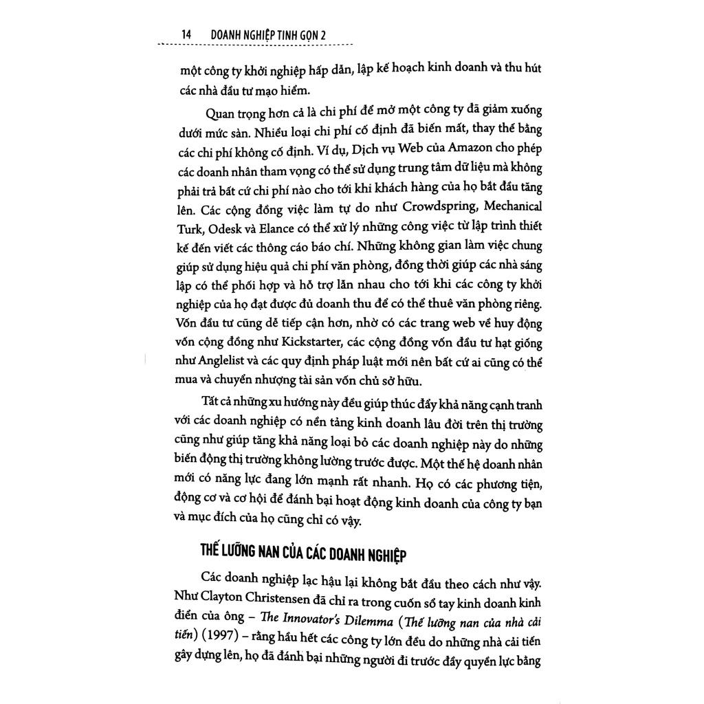 Doanh nghiệp tinh gọn 2 trình bày một thiết kế đột phá nhằm cách mạng hóa các tổ chức lớn, dựa trên các nguyên lý và thực tiễn được cộng đồng khởi nghiệp tán thành, đồng thời giải thích cách để tạo ra một loạt các ý tưởng về sản phẩm hoặc dịch vụ và tìm ra yếu tố quyết định giúp công việc kinh doanh có triển vọng và ổn định trên quy mô của một công ty lớn. Cuốn sách cung cấp cho bạn: