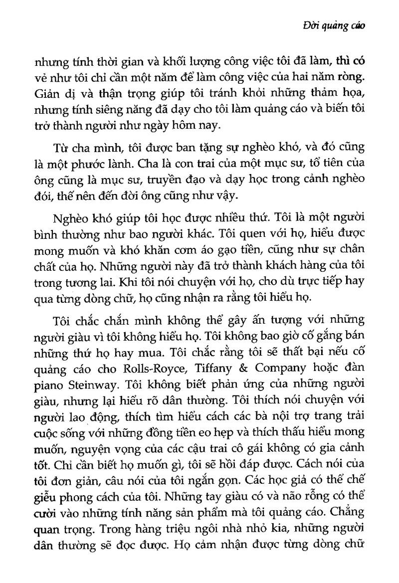 Quyển sách viết về những chiến dịch quảng cáo thực tiễn mà tác giả đã thực hiện cho các thương hiệu nổi tiếng như Palmolive, Pepsodent, Schlitz,… Đây là trải nghiệm thực tế nên không hề hàn lâm.