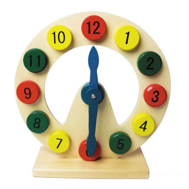 - Dạy con cách nhận biết mặt số, đếm số; tiếp đó là cách xem giờ, tính giờ từ đơn giản (giờ chẵn, giờ rưỡi) đến phức tạp (giờ lẻ, giờ kém). Kim giờ và phút được gắn vào trục có thể quay tùy thích theo ý muốn của trẻ.
