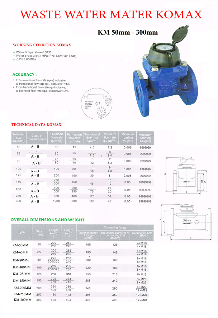 Đồng hồ đo lưu lượng nước thải được thiết kế và sản xuất theo tiêu chuẩn ISO 4064 kết nối bích theo tiêu chuẩn BS/PN10/PN16 hệ DIN lắp đặt nối với hệ thống đường ống xả thải hoặc có thể sử dụng cho bơm hút từ nguồn giếng ngầm, giếng Thông số kỹ thuật và thông tin sản phẩm   Hãng sản xuất : Komax   Chất liệu : thân gang    Kêt nối : Bắt bích   Hiển thị : mặt số hiển thị trực tiếp 99999   Kích thước : dn50 , 2 Inch , phi 60   Kiểu hoạt động : dẫn động từ    Model sản phẩm : KM   Lưu lượng trung bình Qn : 15m3\h   Đơn vị hiển thị nhỏ nhất : 1 m3   Áp lực làm việc : 0,3 - 16 bar   Nhiệt độ làm việc : 0 - 50 độ C   Hàng hóa được Hiệu chuẩn/kiểm định của cơ quan có thẩm quyền đo lường việt nam   Hàng luôn có sẵn và bảo hành 12 tháng   Đồng hồ đo lưu lượng nước thải DN50 Komax là dòng sản phẩm phù hợp sử dụng trong cho các nhà máy xí nghiệp công ty cần thống kê nước thải đầu ra , nước thô cho sản xuất và các loại nước thải đã qua xử lý theo yêu cầu của bộ môi trường .   Vì sự chính xác và ổn định nên đồng hồ đo lưu lượng nước thải komax dn50 có thể gắn sau máy bơm , bồn xả hoặc các  vị trí đầu nguồn nước mà không ảnh hưởng đến chất lượng đo đếm thống kê nước   Với hoạt động dẫn động từ các bộ phận đếm cách ly chân không với dòng nước nên sự bền và ổn định luôn đạt cao nhất cũng như các điểm tì bánh răng truyền động không bị ăn mòn , bị hoen ố mặt số và kẹt rác rất phù hợp cho việc sử đụng để làm đồng hồ đo lưu lượng nước thải cho các khu xử lý nước thải , nước xả thải và nước đầu bơm .   Các chi tiết của đồng hồ được sản xuất tại nền công nghiệp phát triển hàng đầu châu á nên luôn đạt được sự chính xác dù là chi tiết nhỏ nhất, các chất liệu làm ra các chi tiết cũng được đảm bảo sự chống ăn mòn và chống từ tình luôn đạt được chỉ tiêu chất lượng ISO 9002 Sử dụng: Dùng để đo lưu lượng Nước thải, một số đơn vị có thể sử dụng để đo nước giếng bơm có rác, cặn, lá cây, nước đã chưa qua sử lý. Được kiểm định hoăc thử nghiệm làm căn cứ xác định cho hai bên Cấp nước và sử dụng nước. Đơn vị sử dụng: Các công ty, xí nghiệp, khu công nghiệp, Công ty cấp thoát nước, thủy lợi tưới tiê