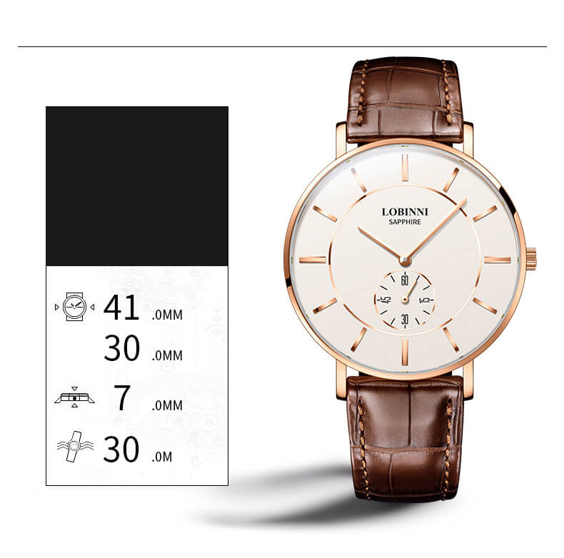 Nhãn hiệu LOBINNI Mã sản phẩm No.16053-9 Giới tính Nam Kiểu máy Automatic (Máy Cơ) Đường kính mặt 43 mm Độ dày 11,5 mm Chất liệu vỏ Thép không gỉ 316L Chất liệu dây Dây da cao cấp Chất liệu mặt kính Sapphire Crystal