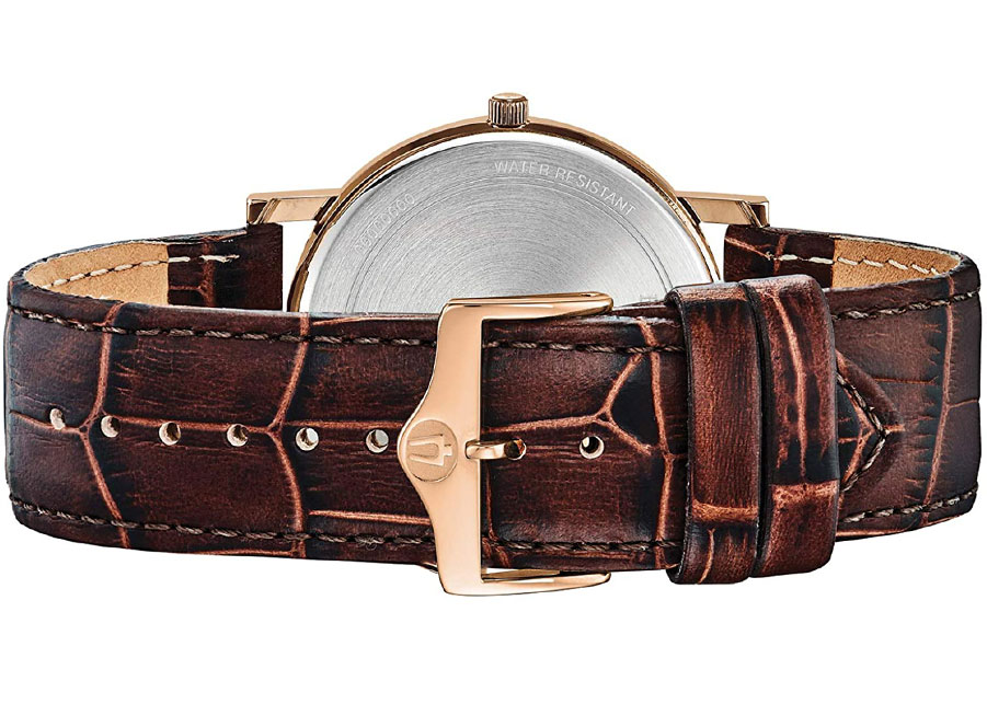 - Vật liệu vỏ / gờ: Sắc vàng kim - Dây đeo bằng da - Mặt kính khoáng - Chống nước - Giờ hiện hành thông thường Đồng hồ kim: 3 kim (giờ, phút, giây)