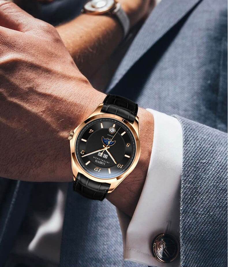 CẢM HỨNG ĐẾN TỪ SẮC MÀU: Với tông màu vàng hồng chủ đạo, cực kì sang trọng cho quý ông sở hữu. Nổi bật nên hình ảnh mặt trăng, mặt trời cực kì độc đáo giúp người đeo xác định giờ ngày đêm.
