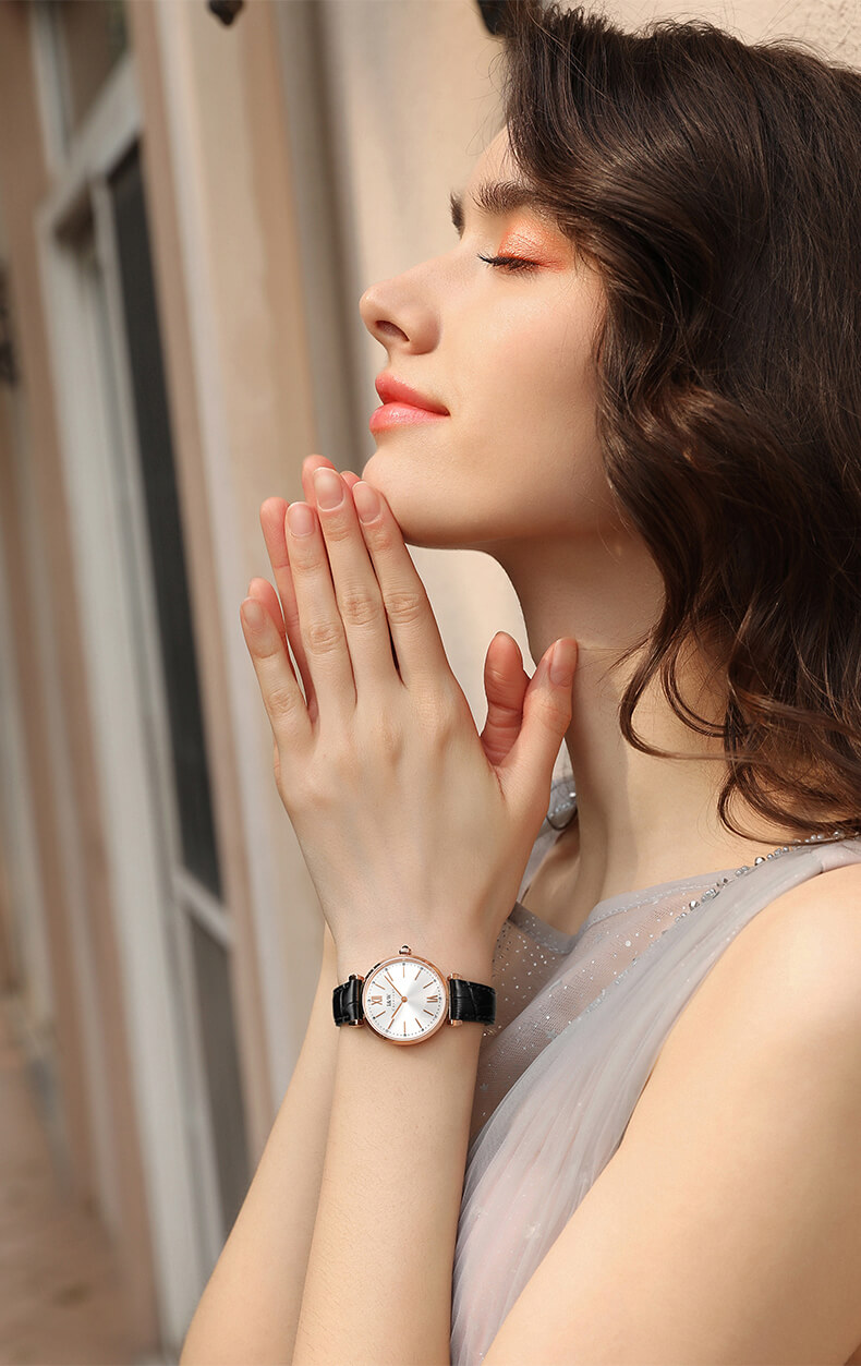 ĐẶC ĐIỂM NỔI BẬT Mã sản phẩm No.3033 Giới tính Nữ Kiểu máy Quartz ( Chạy pin ) Đường kính mặt 34 mm Độ dày 9,5 mm Chất liệu vỏ Thép không gỉ 316L Chất liệu dây Dây da cao cấp Chất
