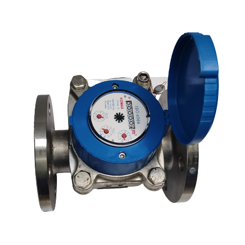 Đồng hồ nước Komax thân gang DN100 mặt bích có thiết kế dạng woltman cho lượng nước thoát qua đồng hồ dễ và thông thoáng hơn, Măt khác bộ chuyển động từ năn cách nước lên