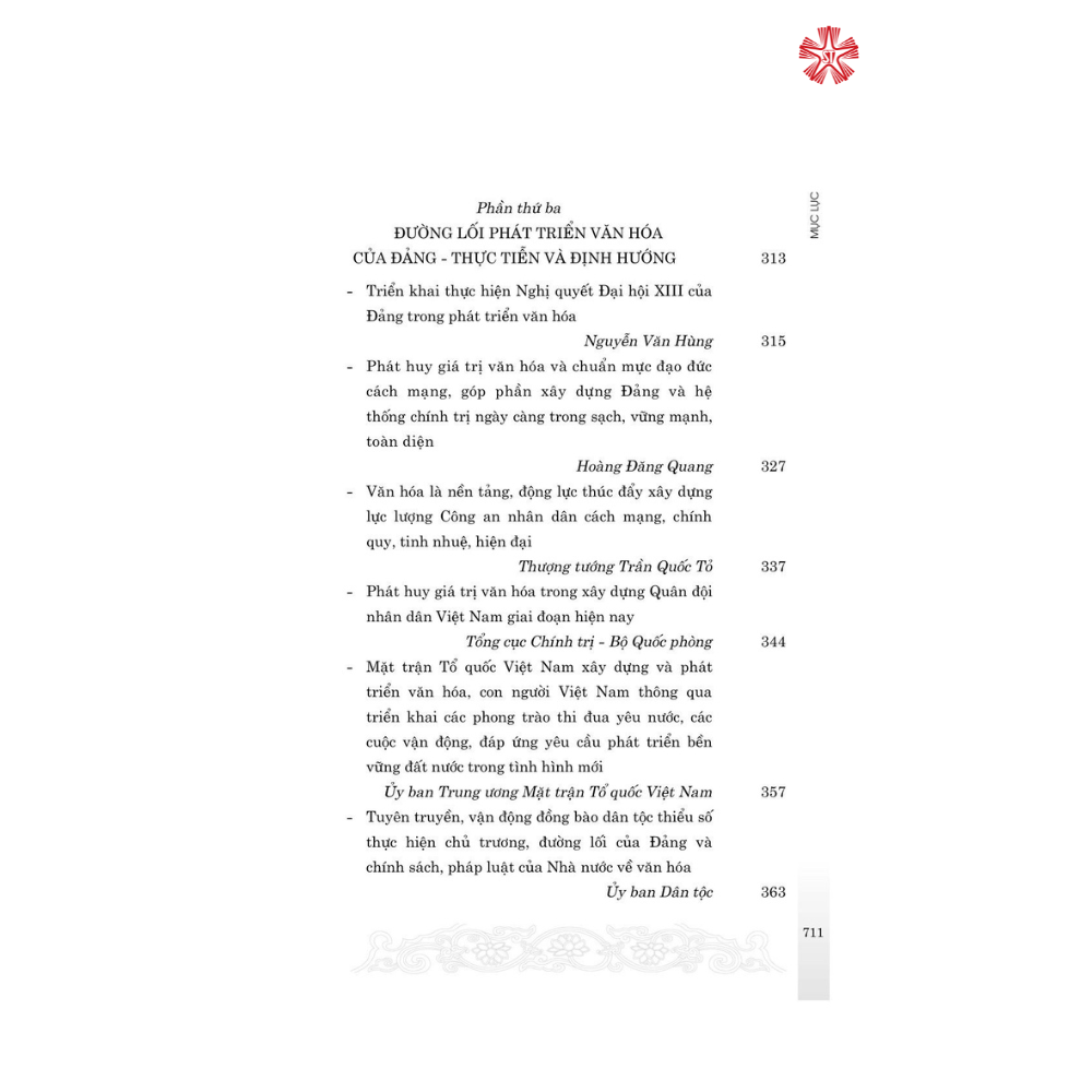 Nội dung gồm các văn bản chỉ đạo mới của Đảng, Nhà nước về chủ trương, đường lối văn hóa trong bối cảnh mới; toàn văn bài viết, phát biểu của Tổng Bí thư Nguyễn Phú Trọng tại Hội nghị văn hóa toàn quốc, tháng 11/2021. Cùng với các bài viết lý luận về xây dựng hệ giá trị văn hóa Việt Nam trong giai đoạn mới và việc tổ chức thực hiện ở một số cơ quan, bộ, ngành, địa phương…