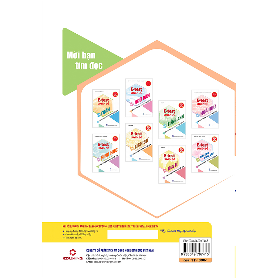 Đặc biệt, bộ sách được tích hợp ứng dụng thi thử trực tuyến, công nghệ E - test 4.0 với mục tiêu hiện đại hóa quy trình học tập, ôn luyện và kiểm tra, đánh giá năng lực học sinh. Ứng dụng cho phép học sinh ôn luyện và làm bài thi thử trực tiếp miễn phí trên nền tảng website và smartphone với số lượng đề thi đa dạng, phong phú được biên soạn bởi các giáo viên uy tín. Khi sử dụng ứng dụng, các em học sinh có thể chủ động trong quá trình thi thử trên máy tính và smartphone mọi lúc,. mọi nơi với chế độ chấm thi tự động và phân tích năng lực học sinh theo từng đơn vị kiến thức.