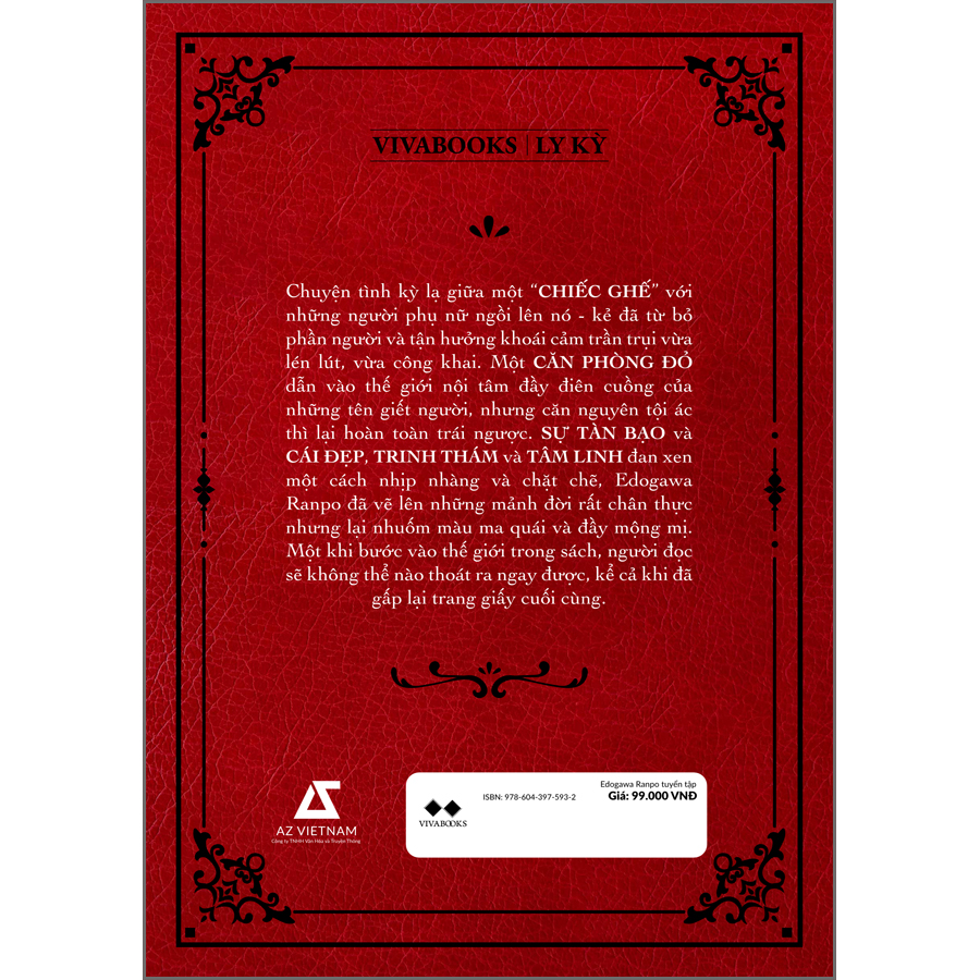 Chuyện tình kỳ lạ giữa một “chiếc ghế” với những người phụ nữ ngồi lên nó - kẻ đã từ bỏ phần người và tận hưởng khoái cảm trần trụi vừa lén lút, vừa công khai. Một căn phòng đỏ dẫn vào thế giới nội tâm đầy điên cuồng của những tên giết người, nhưng căn nguyên tội ác thì lại hoàn toàn trái ngược. Sự tàn bạo và cái đẹp, trinh thám và tâm linh đan xen một cách nhịp nhàng và chặt chẽ, Edogawa Ranpo đã vẽ lên những mảnh đời rất chân thực nhưng lại nhuốm màu ma quái và đầy mộng mị. Một khi bước vào thế giới trong sách, người đọc sẽ không thể nào thoát ra ngay được, kể cả khi đã gấp lại trang giấy cuối cùng.