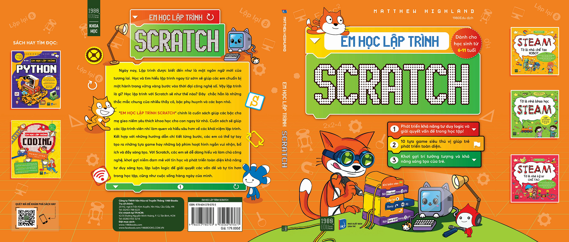 EM HỌC LẬP TRÌNH SCRATCH   Tác giả: Matthew Highland Người dịch: 1980Edu THÔNG TIN XUẤT BẢN: Kích thước khổ: 19,5 x 23 Số trang: 156 Mã EAN: 893 6066 69 3677 NXB liên kết: NXB Dân Trí Sách do Công ty TNHH Văn hóa và Truyền thông 1980 BOOKS mua bản quyền và ấn hành quý II/2022   EM HỌC LẬP TRÌNH SCRATCH   Ngày nay, lập trình được xem là “Ngôn ngữ mới” của tương lai. Các nước phát triển đều đã phổ cập môn học lập trình vào trong các trường học chính quy dành cho các em học sinh Tiểu học.   Để trẻ làm quen sớm với lập trình theo phương pháp vừa học- vừa chơi sẽ giúp trẻ phát triển toàn diện khả năng tư duy logic, phản biện, và đặc biệt là rèn luyện kỹ năng tập trung, kiên nhẫn.   Nhưng lập trình là gì? Học lập trình như thế nào? Đều là những thắc mắc chung của rất nhiều phụ huynh và các em nhỏ.   Cuốn sách “Em học lập trình Scratch” sẽ mang đến câu trả lời hoàn hảo cho các em. Scratch là một trong năm ngôn ngữ lập trình đơn giản dành cho trẻ được ứng dụng rộng rãi trên 150 quốc gia trên thế giới và được dịch ra 70 ngôn ngữ khác nhau.   Với Scratch, trẻ có thể thỏa sức sáng tạo, phát triển khả năng tư duy bằng cách tự tay lập trình tạo ra các games, tạo ra một câu chuyện hay sáng tạo một bộ phim hoạt hình ngắn.   Scratch không chỉ giúp các em học tập khoa học hơn mà còn giúp các em có thêm tình yêu với khoa học công nghệ. Để chuẩn bị một hành trang vững vàng bước vào tương lai thì học lập trình chính là chìa khóa giúp các em vươn ra thế giới, hướng tới năm châu.