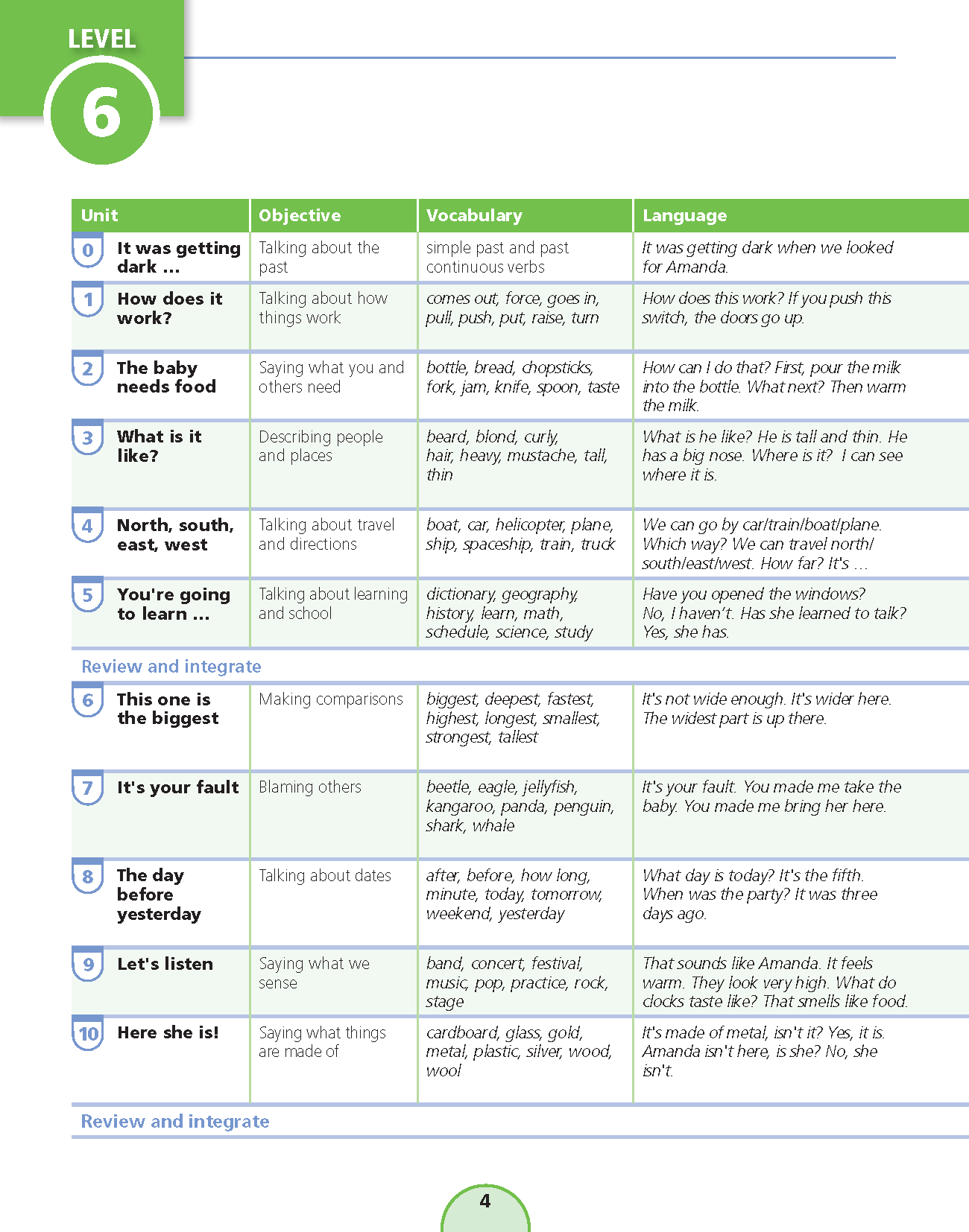 Sách: Learning English 4 - Dành Cho Học Sinh Lớp 4 NỘI DUNG VÀ CẤU TRÚC CỦA QUYỂN SÁCH : Bảng mục lục: Chỉ rõ các mục tiêu chính và trọng tâm của mỗi bài