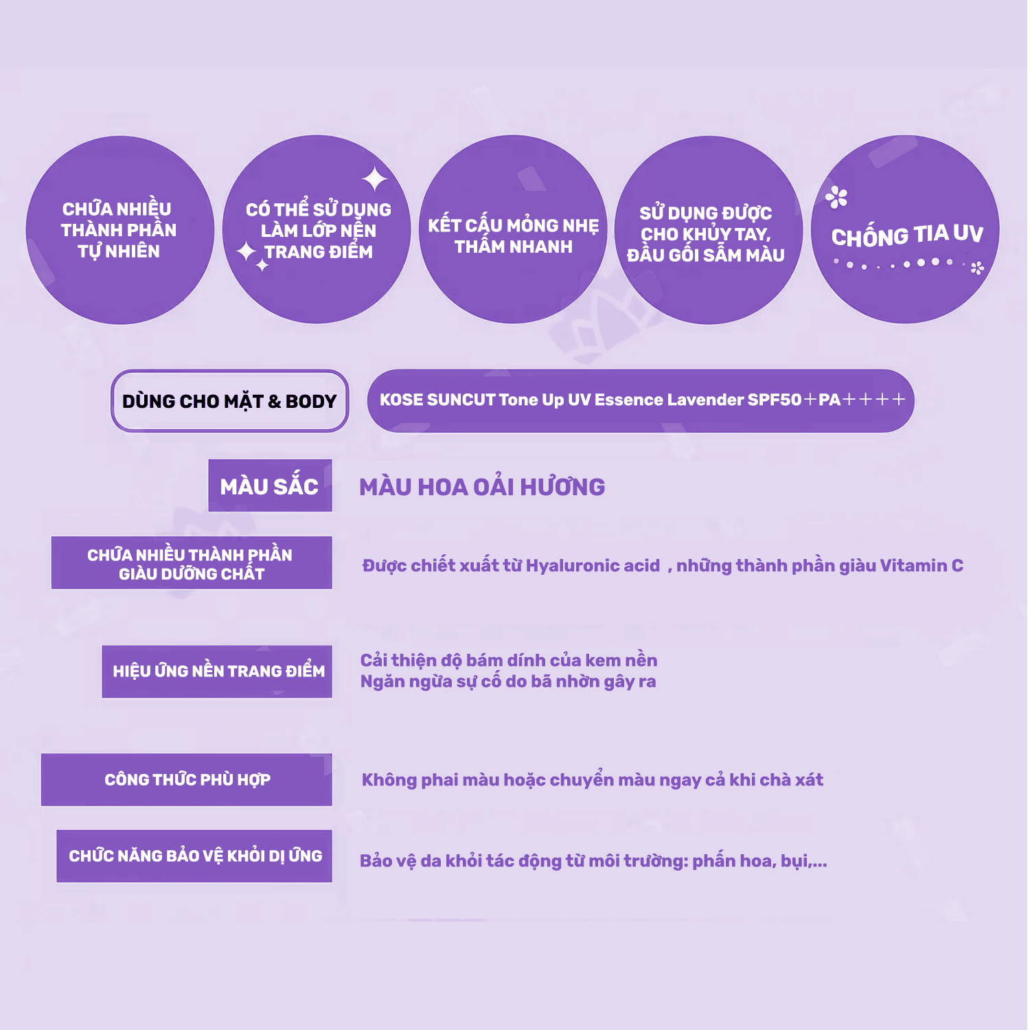 - Chống lại tia UVA, UVB, ánh sáng xanh, tia cực tím phân kì ko chạm da - Cấp ẩm đi sâu vào đủ 3 tầng bì giúp tạo độ căng mọng, sáng đẹp tự