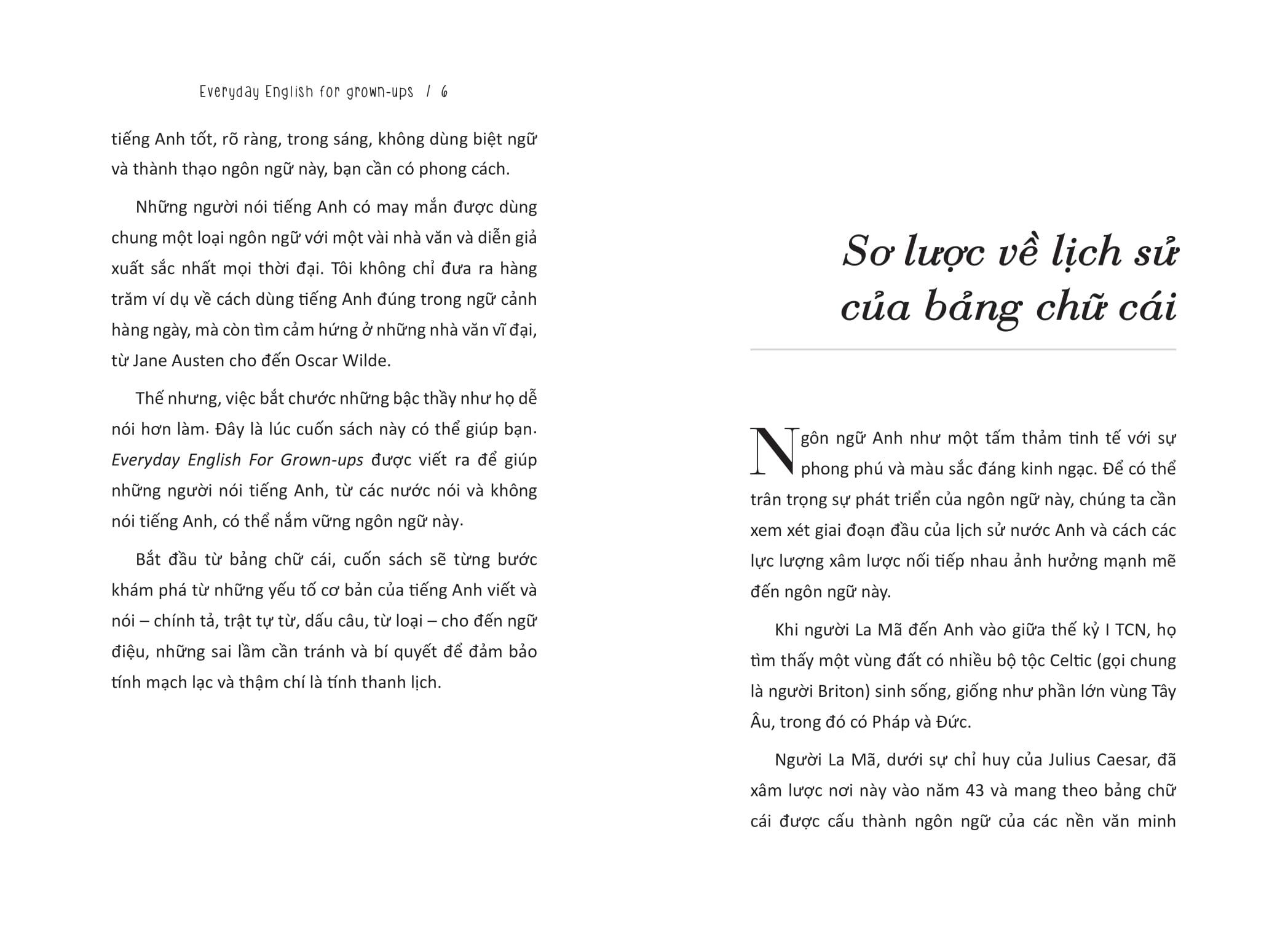 Bắt đầu từ bảng chữ cái, cuốn sách sẽ từng bước khám phá từ những yếu tố cơ bản của tiếng Anh viết và nói – chính tả, trật tự từ, dấu câu, từ loại – cho đến ngữ điệu, những sai lầm cần tránh và bí quyết để đảm bảo tính mạch lạc và thậm chí là tính thanh lịch.