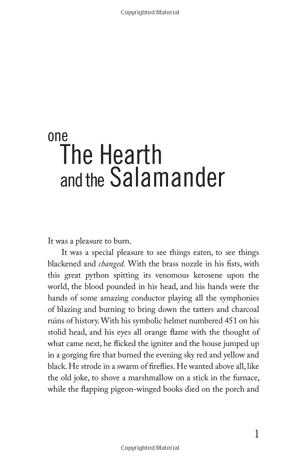 Guy Montag enjoyed his job. He had been a fireman for ten years, and he had never questioned the pleasure of the midnight runs nor the joy of watching pages consumed by questioned anything until he met a seventeen-year-old girl who told him of a past when people were not afraid.