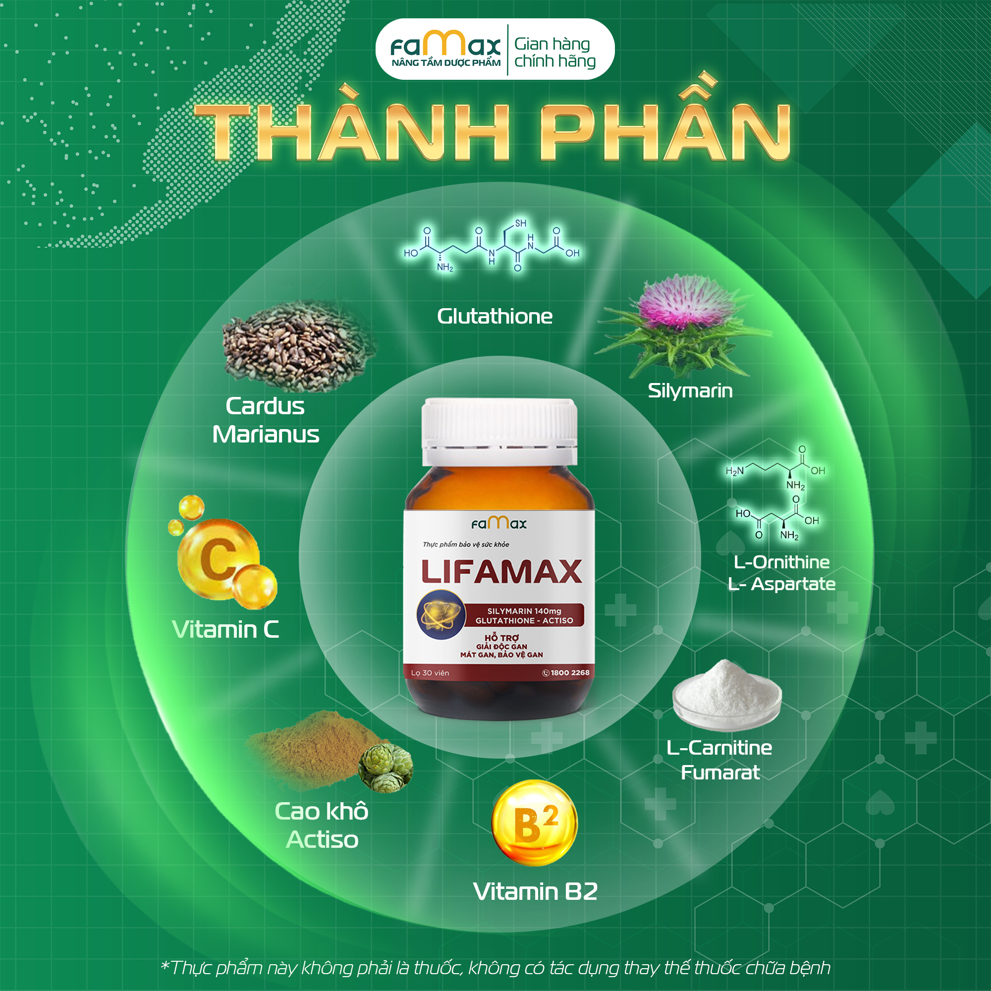 THỰC PHẨM BẢO VỆ SỨC KHỎE LIFAMAX Thành phần Trong 1 viên chứa: Glutathione…………………………………………………………………………… 150mg Silymarin……………………………………………………………………………….. 140mg (Cardus marianus extract 280mg) Cao khô Actiso (Cynara scolymus)…………………………………… 50mg (tương đương 2000 mg thảo mộc khô) L-Ornithine