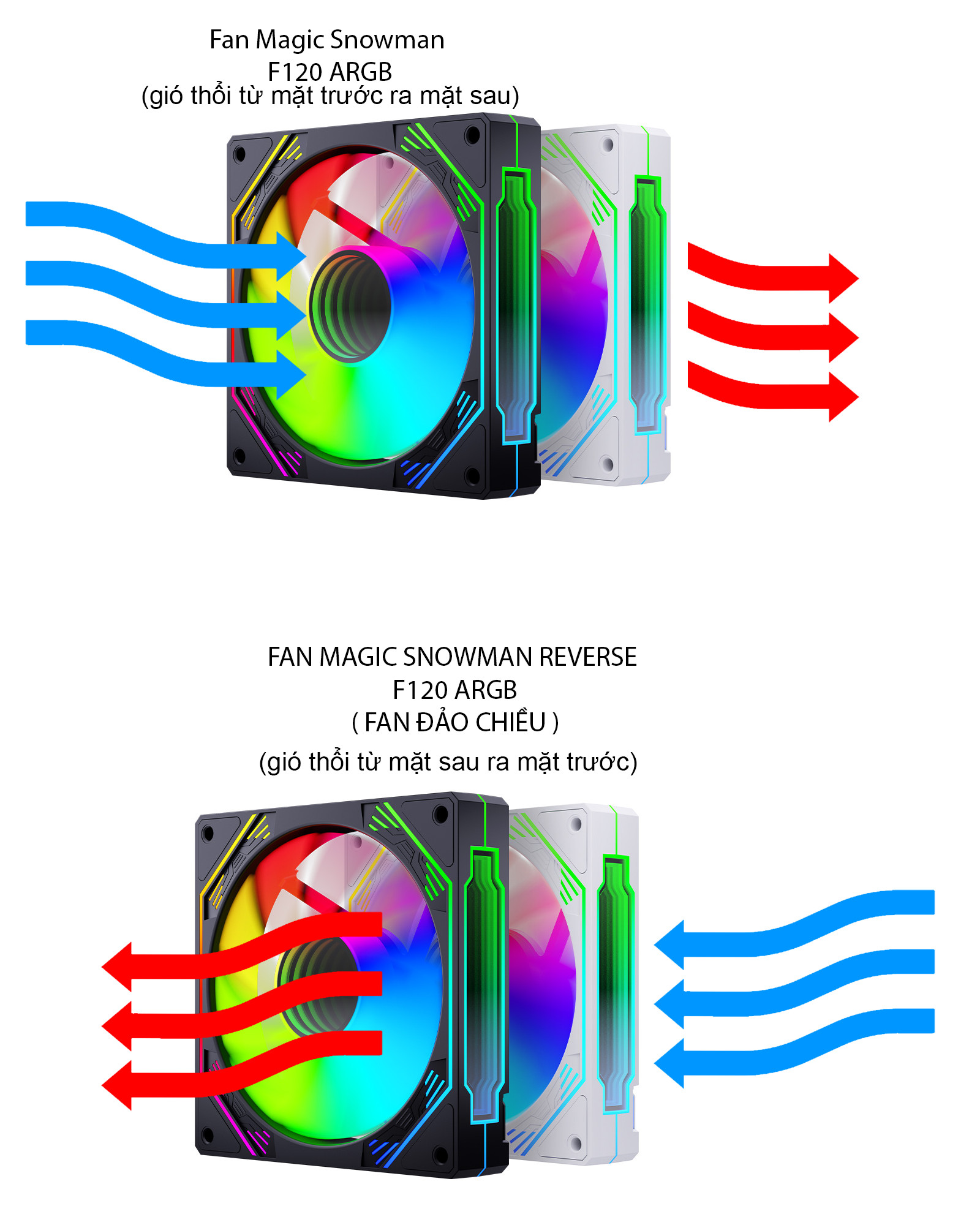 Thông tin sản phẩm: • Thương hiệu: Magic • Model: Fan Magic Snowman F130 ARGB / Fan Magic Snowman F130 ARGB REVERSE • Kích thước: 120 x 120 x 25 (mm) – Phù hợp cho