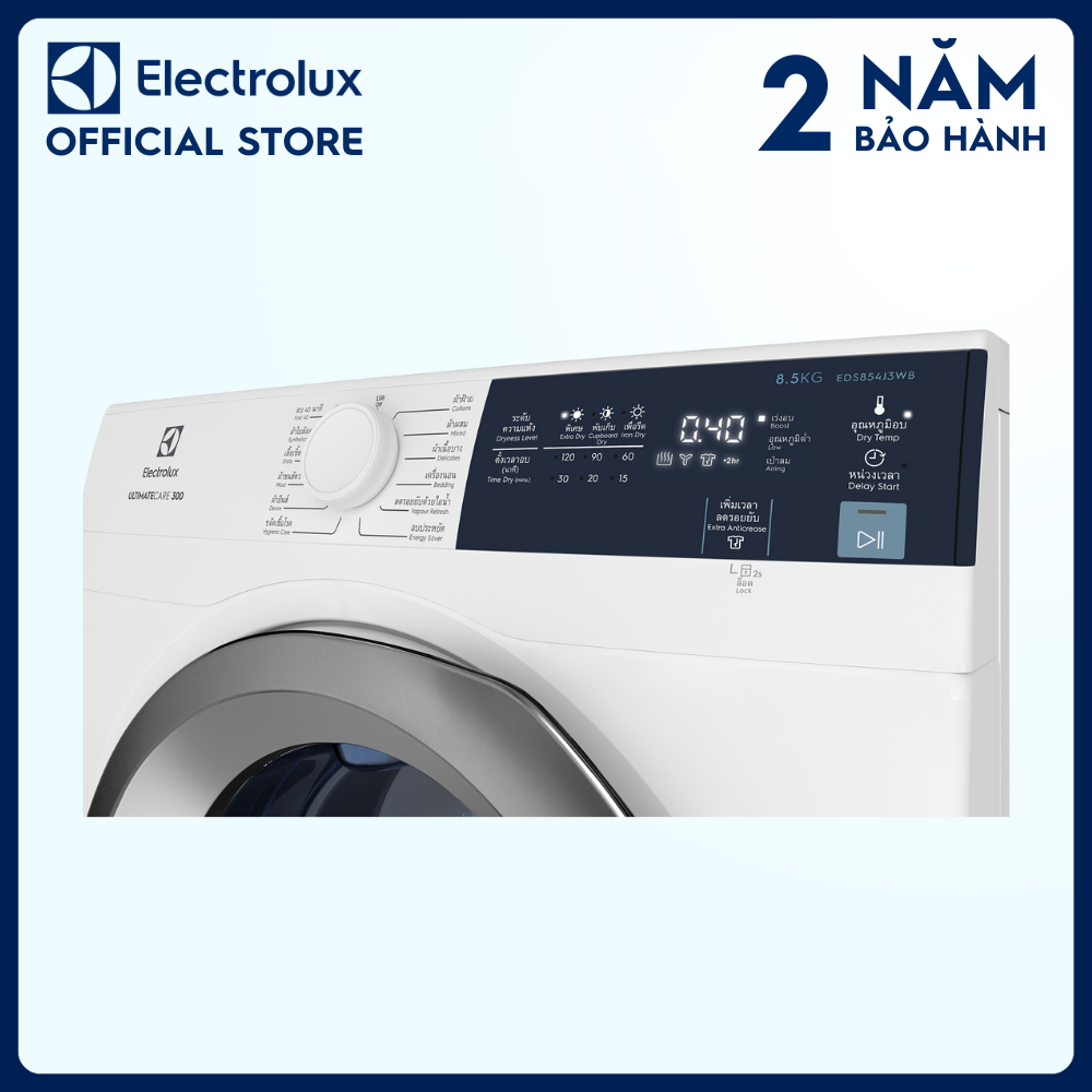 Thông số kỹ thuật Máy sấy quần áo Electrolux 8.5 kg EDS854J3WB Trắng Đặc điểm sản phẩm Model: EDV854J3WB Màu sắc: Trắng Nhà sản xuất: Electrolux Xuất xứ: Thái Lan Thời gian bảo hành: 24