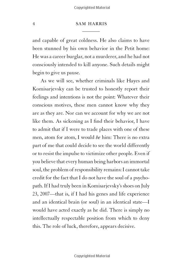 The physiologist Benjamin Libet famously demonstrated that activity in the brain's motor regions can be detected some 300 milliseconds before a person feels that he has decided to move. Another lab recently used fMRI data to show that some "conscious" decisions can be predicted up to 10 seconds before they enter awareness (long before the preparatory motor activity detected by Libet). Clearly, findings of this kind are difficult to reconcile with the sense that one is the conscious source of one's actions. The question of free will is no mere curio of philosophy seminars. A belief in free will underwrites both the religious notion of "sin" and our enduring commitment to retributive justice. The Supreme Court has called free will a "universal and persistent" foundation for our system of law. Any scientific developments that threatened our notion of free will would seem to put the ethics of punishing people for their bad behaviour in question.In Free Will Harris debates these ideas and asks whether or not, given what brain science is telling us, we actually have free will?