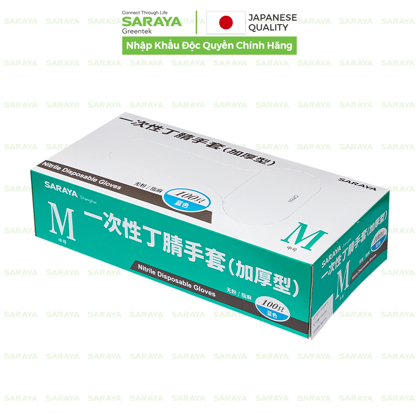 Thương hiệu: SARAYA. Xuất xứ thương hiệu: NHẬT BẢN. Xuất xứ: Trung Quốc. Quy cách đóng gói: 100 cái/ hộp, 10 hộp/ thùng. Đặc tính & công dụng sản phẩm: Dày, Không mùi, Không bột, Không chứa Latex. Hướng dẫn sử dụng: - Chế biến thực phẩm. - Công nghiệp điện tử. - Vệ sinh nhà cửa. - Spa và làm đẹp. - Vệ sinh y tế. - Vệ sinh công cộng - Dùng một lần, có thể sử dụng cho cả 2 tay (tay trái và tay phải). Hướng dẫn bảo quản: Nơi khô ráo, thoáng mát tránh ánh sáng mặt trời trực tiếp, ánh sáng đèn huỳnh quang, tia X, hơi ẩm hoặc ozone. Tránh bảo quản ở nhiệt độ trên 60 độ C.