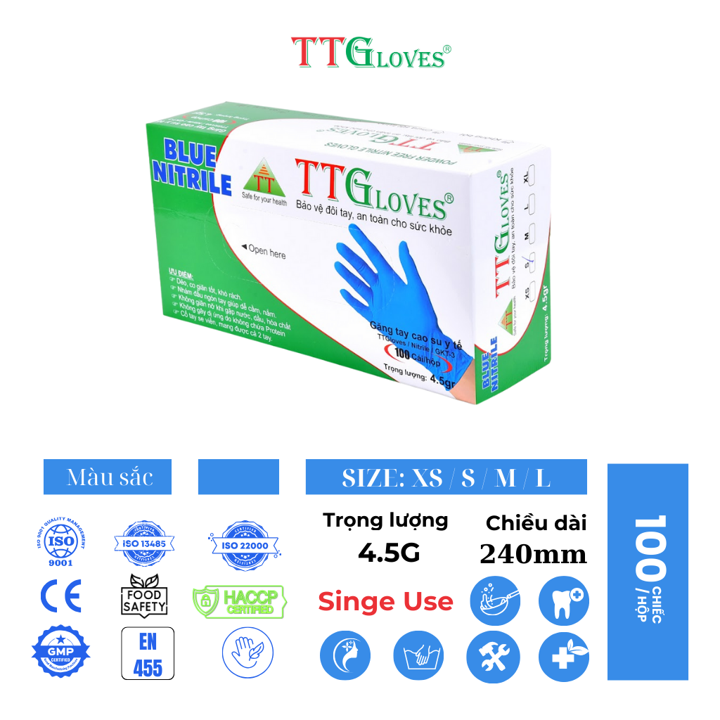 Mua tại TiktokGăng Tay Cao Su Y Tế Size M Không Bột Nitrile TTGLOVES Màu Xanh (100 Chiếc) TTGLoves là thương hiệu găng tay của công ty TNHH Sản Xuất & Thương Mại Toàn Tâm Gloves. Sản phẩm găng tay y tế Nitrile của TTGloves đã khắc phục những hạn chế của găng tay Latex, mang lại sự dẻo dai, đàn hồi và thoải mái tuyệt vời cho người dùng. Hãy trải nghiệm và cảm nhận sự khác biệt mà chúng tôi mang lại. THÔNG TIN SẢN PHẨM