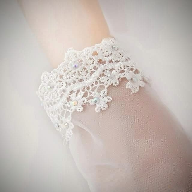 Găng tay Cô dâu và Dạ hội MS: 40761 Chất liệu: găng ren trong, kín ngón, cổ tay đính ren có hạt 7 màu, trắng kem Kiểu dáng: bao kín ngón, dài hết cổ tay
