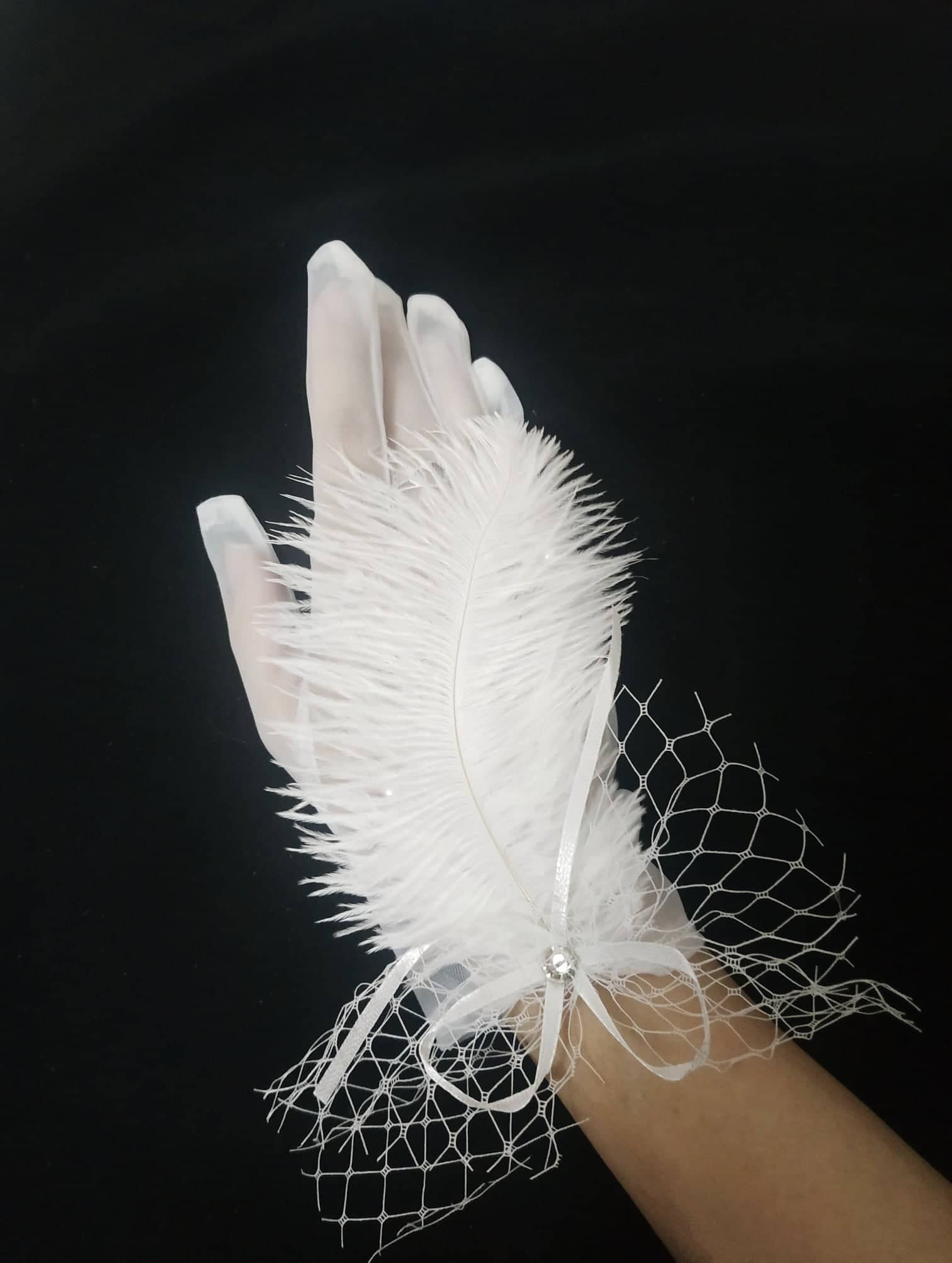 ✨Găng tay trong suốt đính lông vũ, ngọc trai và ren lưới cho Cô dâu và Dạ hội, đi tiệc, sự kiện, lễ hội, chụp ảnh MS: 43750
