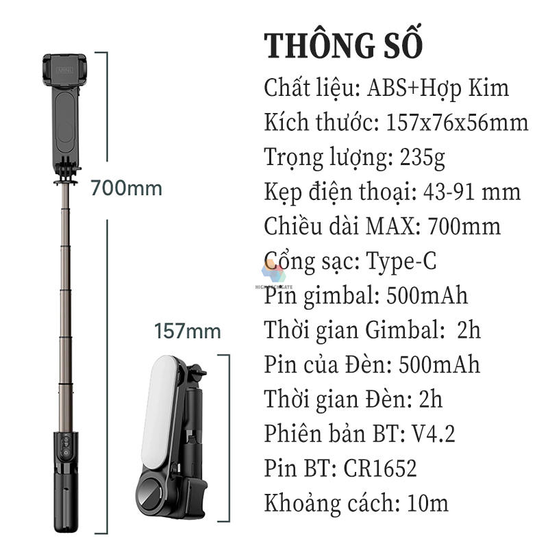 ✨Gậy Chụp Hình Gimbal Chống Rung HIGH TECH GATE Q09 Mini Cầm Tay Du Lịch, Chụp Ảnh Tự Sướng Selfie, Quay Video, Livestream, Quay Tiktok Mọi Nơi, Có Đèn Sáng Tháo Rời, Hàng Chính Hãng