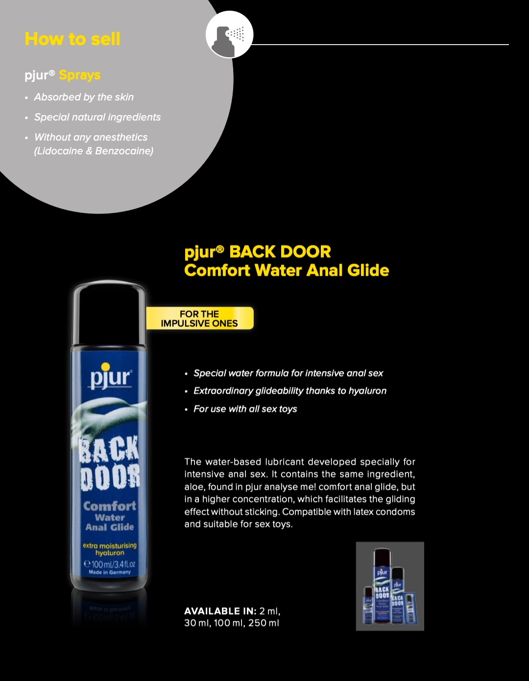 • Chất bôi trơn gốc nước cho quan hệ đường hậu pjur BACK DOOR Moisturising Anal Glide có cảm giác gần như silicone, có tác dụng bôi trơn rất lâu nhờ vào nồng độ hyaluron cao, tạo ra các đệm nước nhỏ.