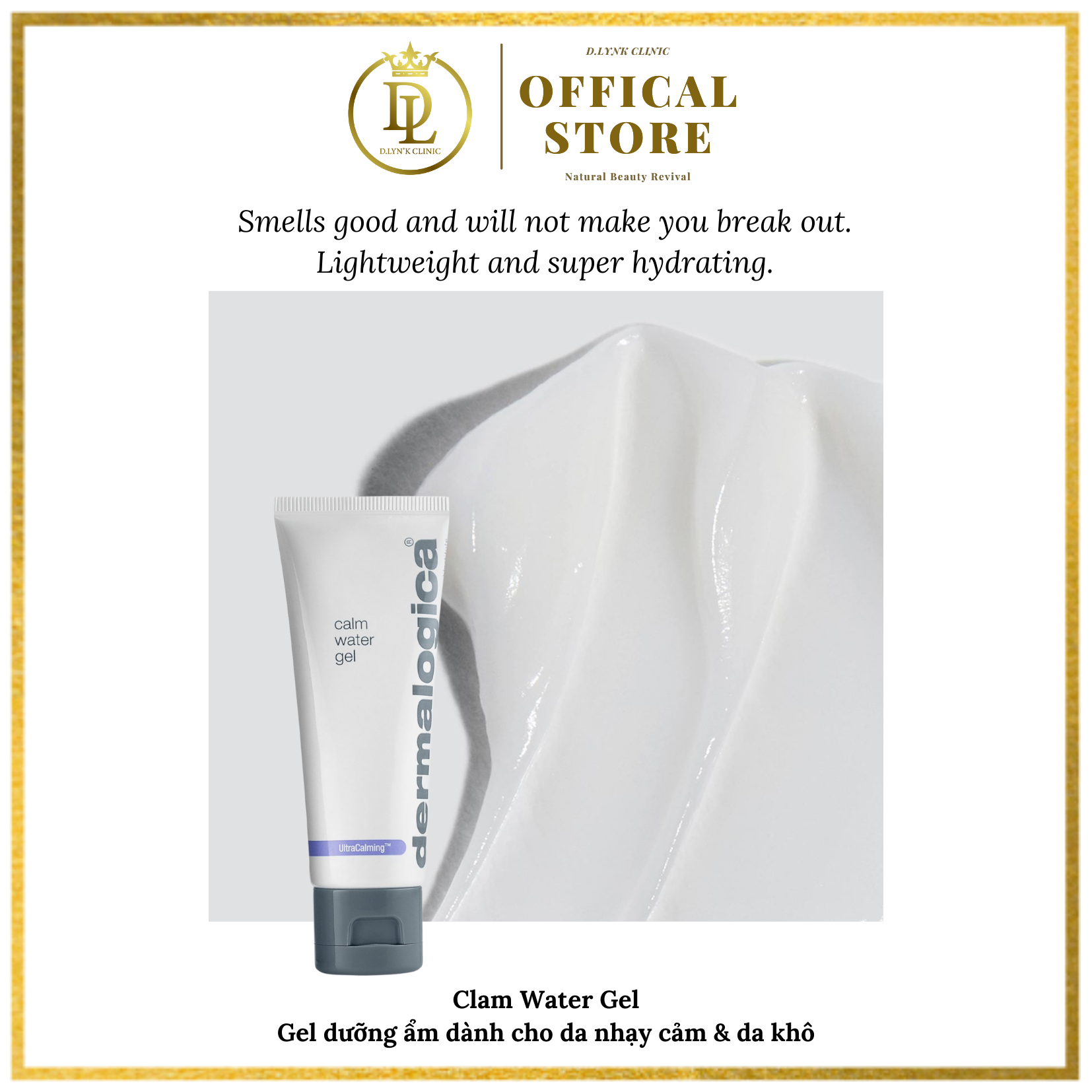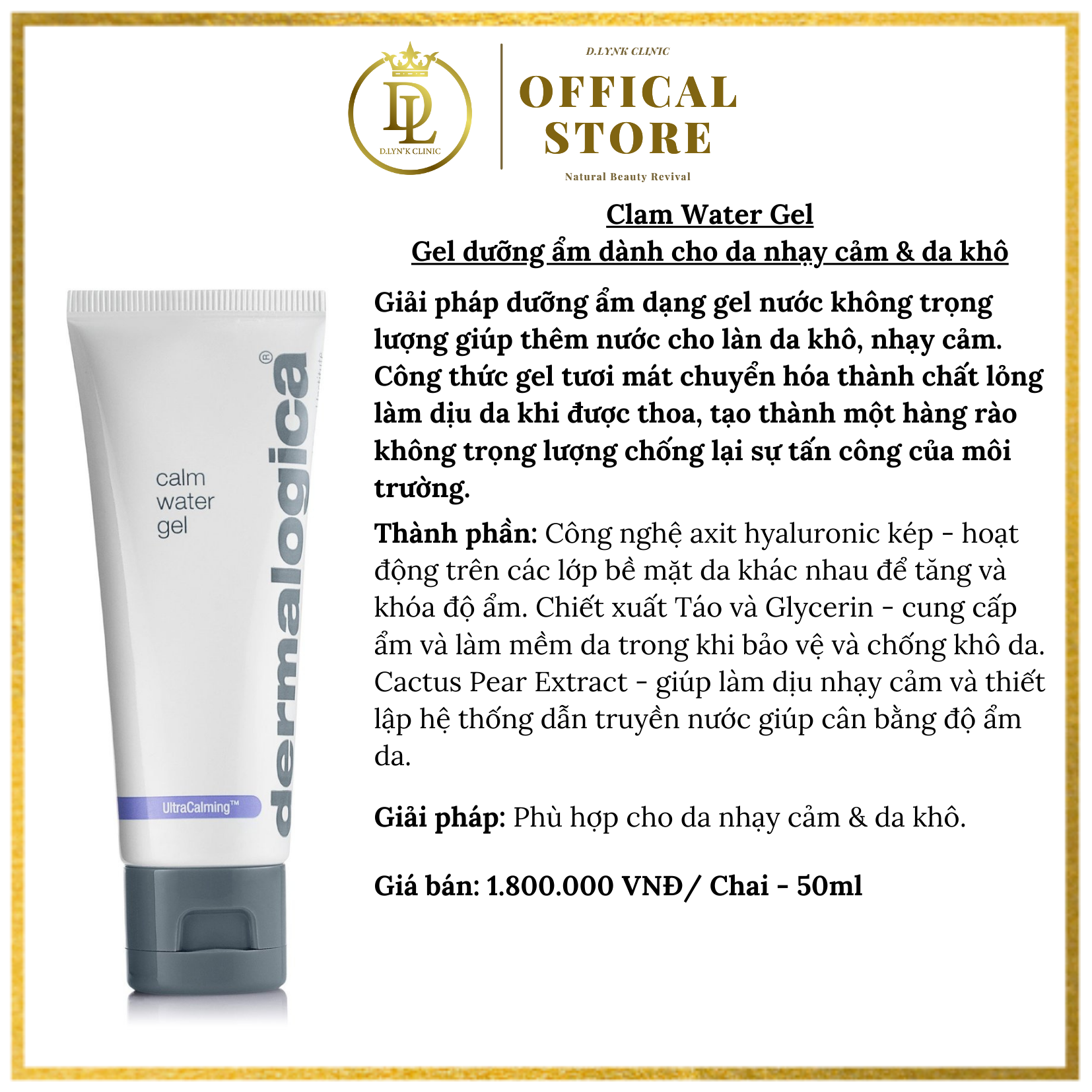Mua tại TiktokGel dưỡng ẩm Dermalogica Calm Water Gel 50ml dành cho da nhạy cảm & da khô Gel-nước dưỡng ẩm da nhạy cảm Dermalogica Calm Water Gel là sản phẩm chuyên dùng cho làn da nhạy cảm có công thức từ gel được làm mới hơn là chuyển thành dạng dung dịch chất lỏng dễ thấm thấu vào sâu bên trong da hơn. Từ đó đưa lại tác dụng hiệu quả nhanh chóng làm dịu da cho làn da được mềm mại, mịn màng và còn tạo thành một lớp màng bảo vệ, chống lại các sự tấn công của môi trường. Bên cạnh đó với công nghệ axit hyaluronic kép hoạt động trong các lớp bề mặt da khác nhau giúp tăng cường và khóa độ ẩm. THÔNG TIN SẢN PHẨM