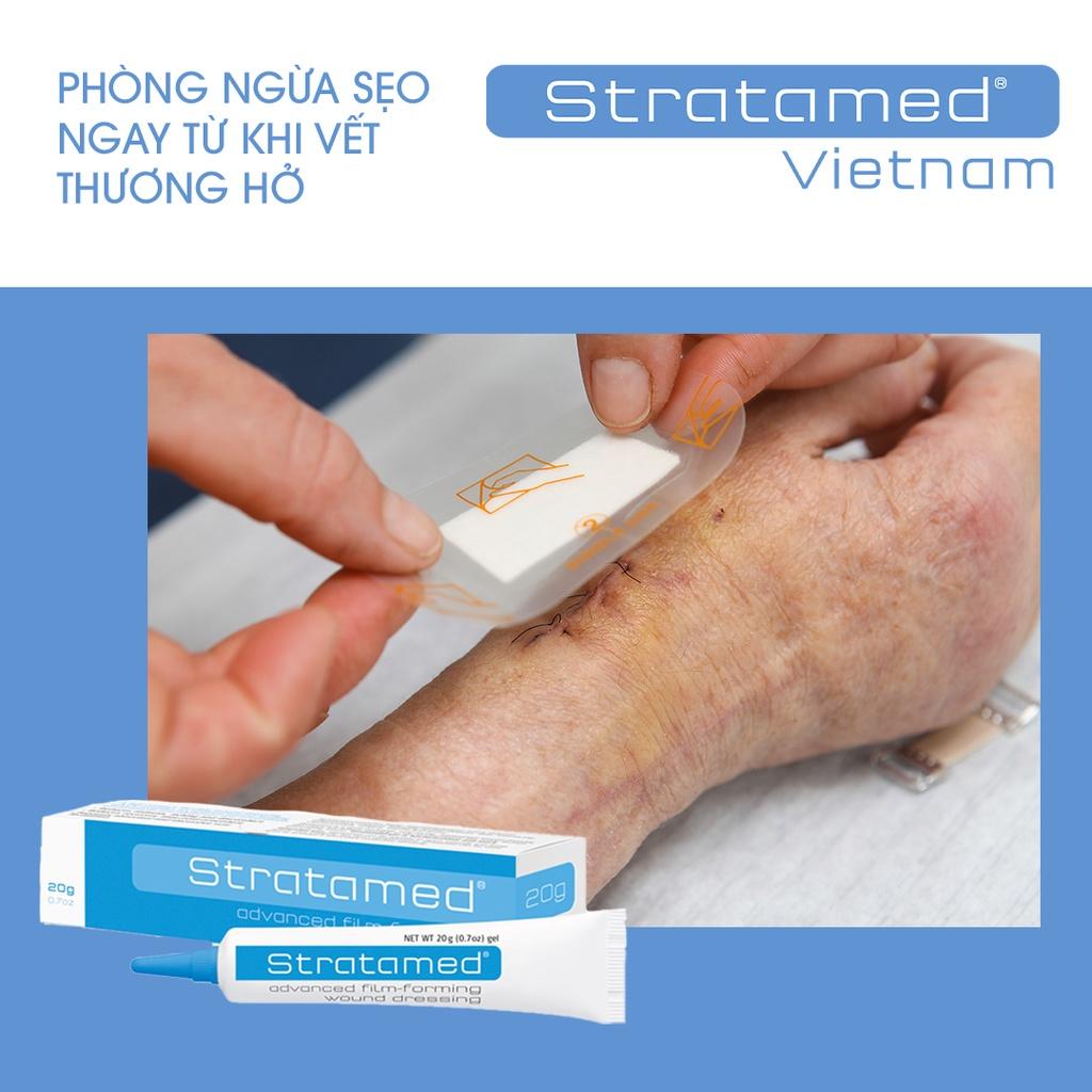 Stratamed là Gel silicone đầu tiên & duy nhất trên thị trường được cấp phép sử dụng trên vết thương hở. Đối với trường hợp vết mổ vào những ngày đầu, việc sử dụng Stratamed sẽ giúp vết thương tránh được tình trạng nhiễm trùng do vi khuẩn từ bên ngoài thâm nhập.Sản phẩm tạo ra một môi trường bán kín cấp ẩm cho mô của vết thương, cho phép các tế bào sừng di chuyển qua lớp nền của vết thương nhanh hơn, giúp rút ngắn thời gian lành vết thương lên đến 50%, giảm phản ứng viêm, cảm giác ngứa rát và ngăn ngừa sẹo hình thành. Tuýp 5g có thể sử dụng từ 1-3 tháng tùy vào kích thước vết sẹo.
