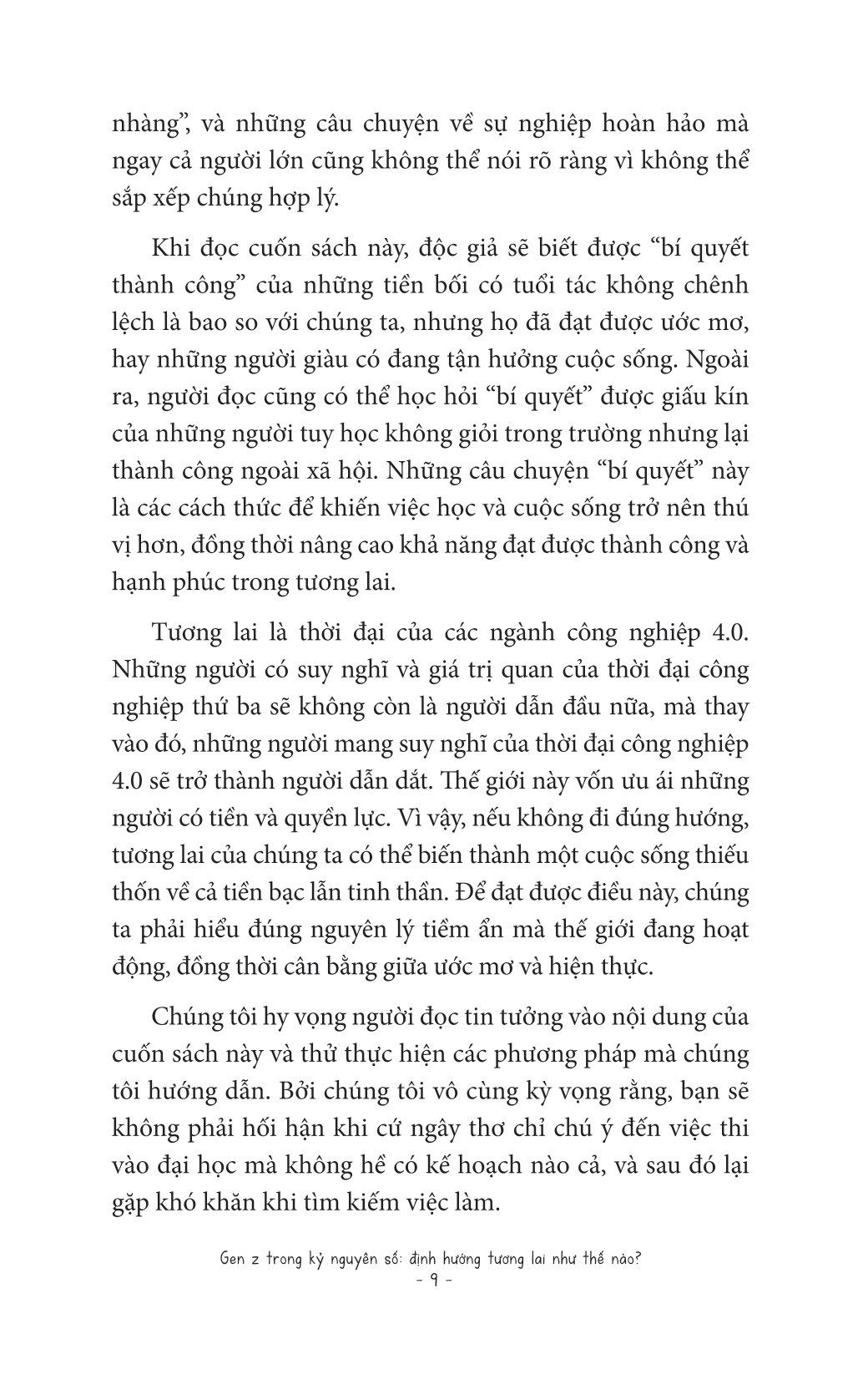 Trong cuốn sách Gen Z trong kỷ nguyên số: Định hướng tương lai như thế nào?, tác giả Yun Kyu Hoon thông qua những cuộc nói chuyện với hơn 330.000 thanh thiếu niên tại các trường trung học sẽ chỉ cho bạn thấy cách làm thế nào để vạch ra một con đường sự nghiệp tương lai đúng đắn dù bạn đã có đam mê hay chưa tìm ra. Việc định hướng này rất quan trọng, đặc biệt trong tình hình cả thế giới đang đối mặt với đại dịch covid và sự thay đổi chóng mặt do nền công nghiệp 4.0 mang lại. Những tư duy nào nên có, những nghề nghiệp nào nên được ưu tiên, những kỹ năng nào cần đào sâất cả đều đang chờ bạn lật mở cuốn sách này để khám phá.