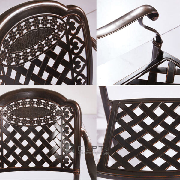 Ghế Cafe sân vườn nhôm đúc màu đồng CC2017-A Nội thất Capta Ghế ngoài trời có tay tựa thân ghế hình bông sen - Chất liệu: nhôm đúc sơn tĩnh điện màu đồng - Thiết