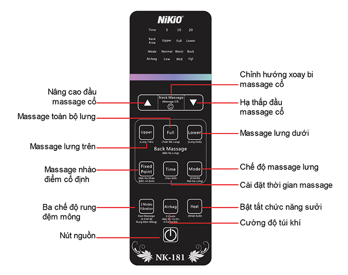 Nút Air Bag: Tùy chỉnh cường độ áp suất không khí. Nhấn lần đầu tiên túi khí co bóp với cường độ thấp, lần nhấn thứ hai co bóp với cường độ trung bình, lần nhấn thứ ba túi khí co bóp với cường độ cao, lần nhấn thứ tư để dừng chức năng massage túi khí. (Cường độ co bóp túi khí được hiển thị ở màn hình phía trên).