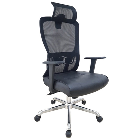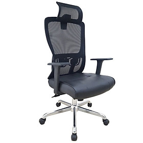 lưng cao. Khung tựa nhựa bọc vải lưới , đệm bọc PVC may trang trí. Ghế có khả năng điều chỉnh độ cao và độ ngả tựa, tay chữ T tăng chỉnh được chiều cao. Chân thép mạ.
