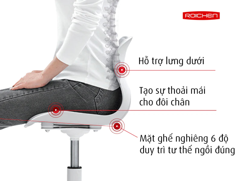 Ghế chỉnh dáng ngồi đúng có chân xoay từ thương hiệu Roichen Hàn Quốc được thiết kế giúp cho người dùng duy trì tư thế ngồi đúng một cách thoải mái, vững chãi, đưa cột sống quay trở về đường cong sinh lý. Điều này giúp ngăn ngừa các bệnh văn phòng do ngồi nhiều như đau lưng, cổ, vai, gáy...Hoặc thiếu tập trung khi học tập và làm việc do tư thế ngồi chưa đúng.