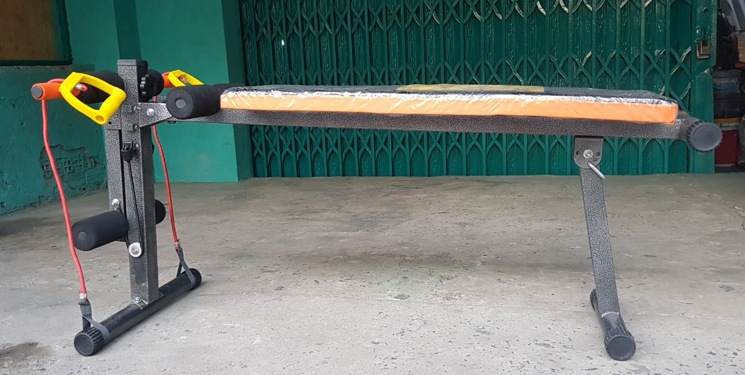 HƯỚNG DẪN SỬ DỤNG 1/ Tập bụng trên: Ngồi vào ghế như hình móc 2 chân vào đệm cao su, nằm thẳng người xuống, hít hơi vào dùng sức nâng người lên lúc này thở ra. Ngồi như tư thế trên, khi xuống kết hợp vặn người sang trái (hoặc phải) để tập eo. 2/ Tập bụng dươi: Nằm ngửa, 2 tay bám vào đệm cao su, 2 chân duỗi thẳng nâng lên cao, thóp bụng, hít hơi vào lại rồi hạ xuống từ từ không chạm đất, lúc này thở ra . Rồi lập lại như trên nhiều lần. 3/ Tập vai tay trước: Ngồi móc chân vào đệm cao su, hai tay nắm đầu dây, kéo căng lực dây ra 2 bên, lập đi lập lại nhiều lần. 4/ Tập hít đât: Hai tay nắm vào đầu mút. Người ngã về hướng ghê, hai khuỷu tay gấp lại đồng thời hít vào. Dùng lực cổ tay, cánh tay, đẩy thân người nhô lên, thở ra. Lập lại nhiều lần. 5/ Tập ngực trên Ghế với tạ: Nằm ngữa trên ghế: 2 chân móc vào cao su, 2 tay nâng tạ lên cao, tập ngực và tay sau. 6/ Tập cơ lưng tư thế nằm sấp: Nằm sấp 2 chân cài vào đệm cao su, 2 tay đặt sau gáy, nâng người lên. Tập cơ lưng khòe dẻo dai.